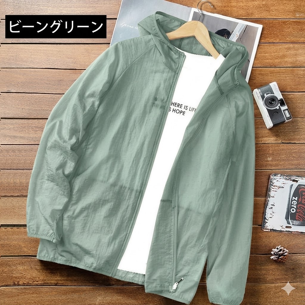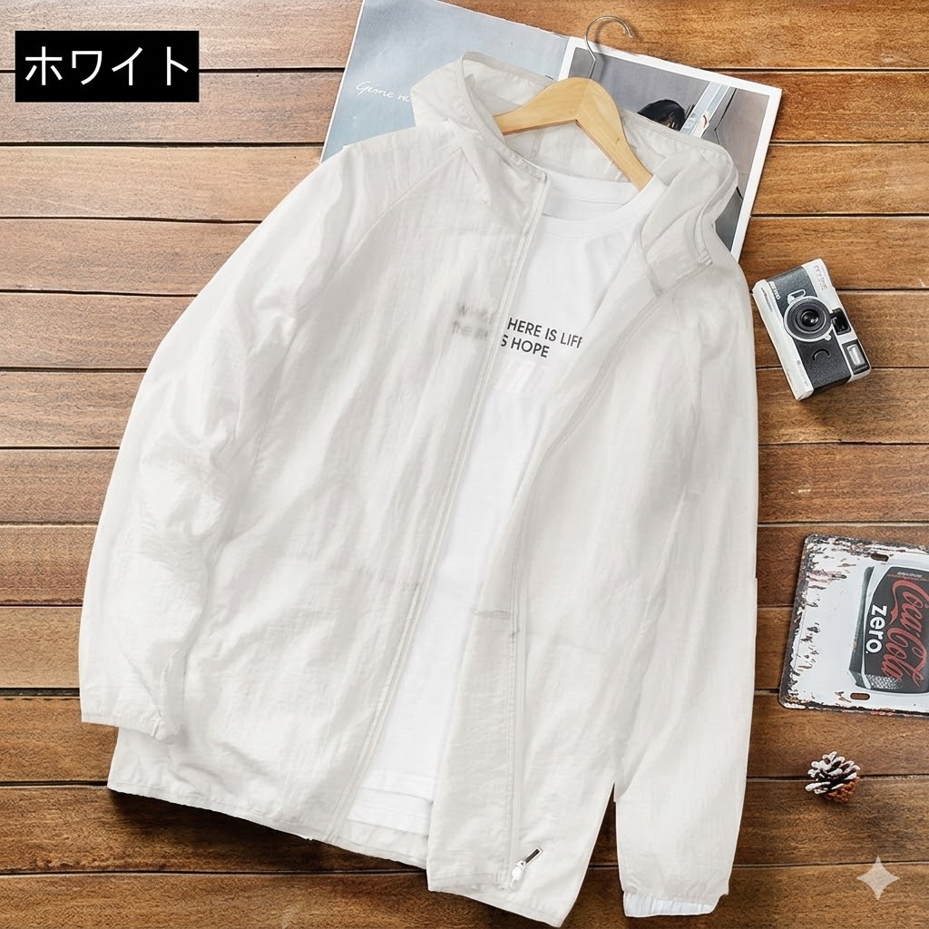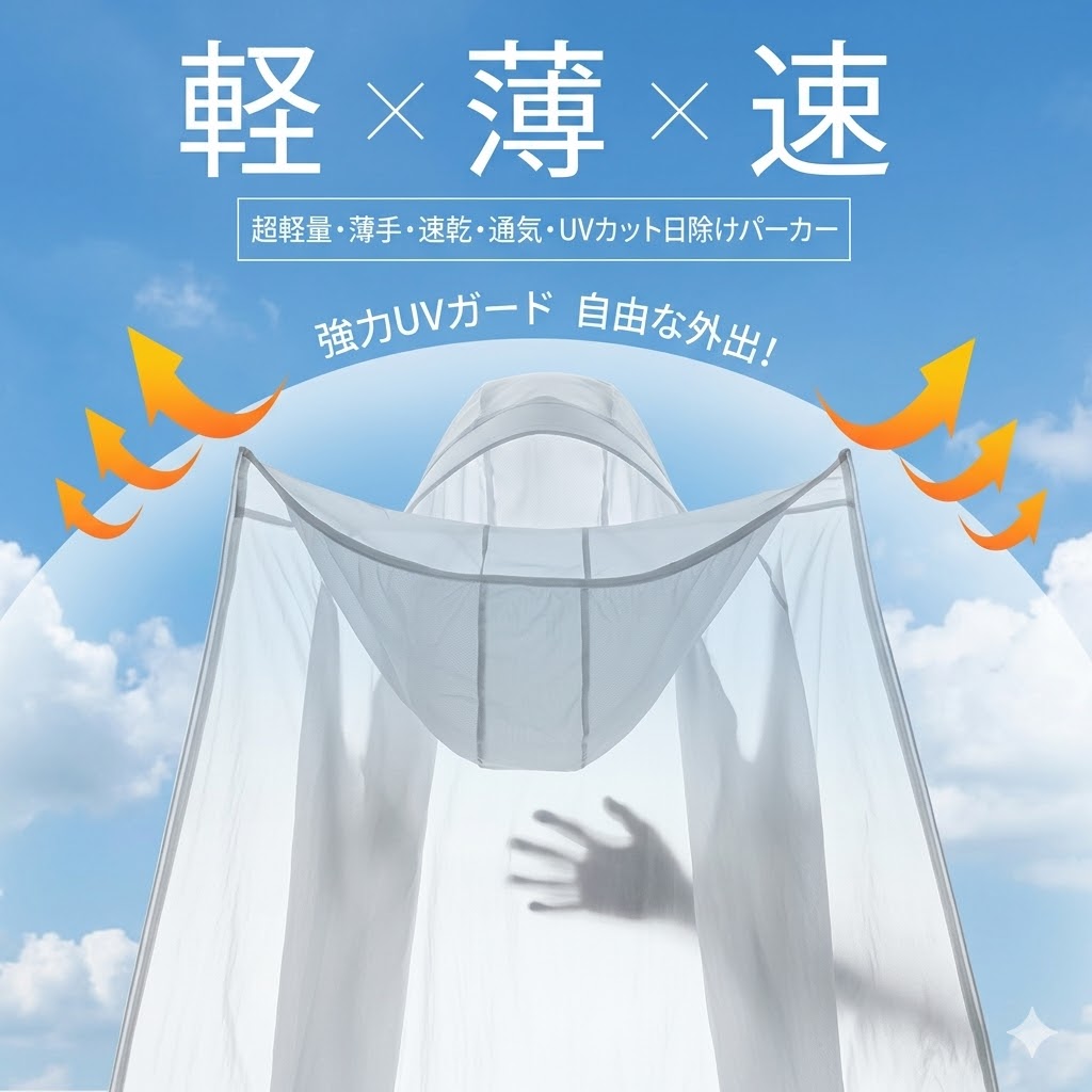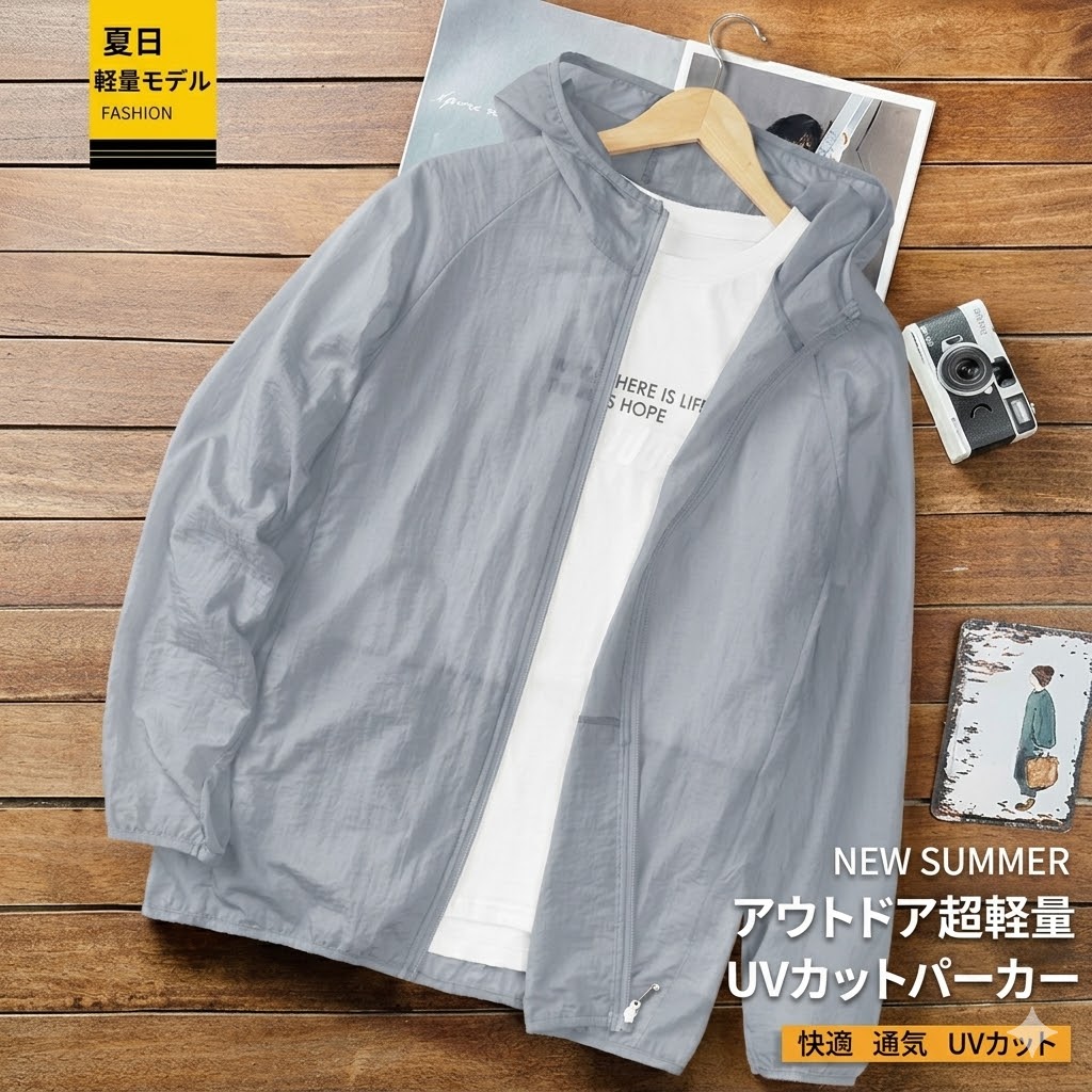フーデッドデザイン:フード付きで首元や頭部までしっかり紫外線をガード。実用性とデザイン性を両立しています。