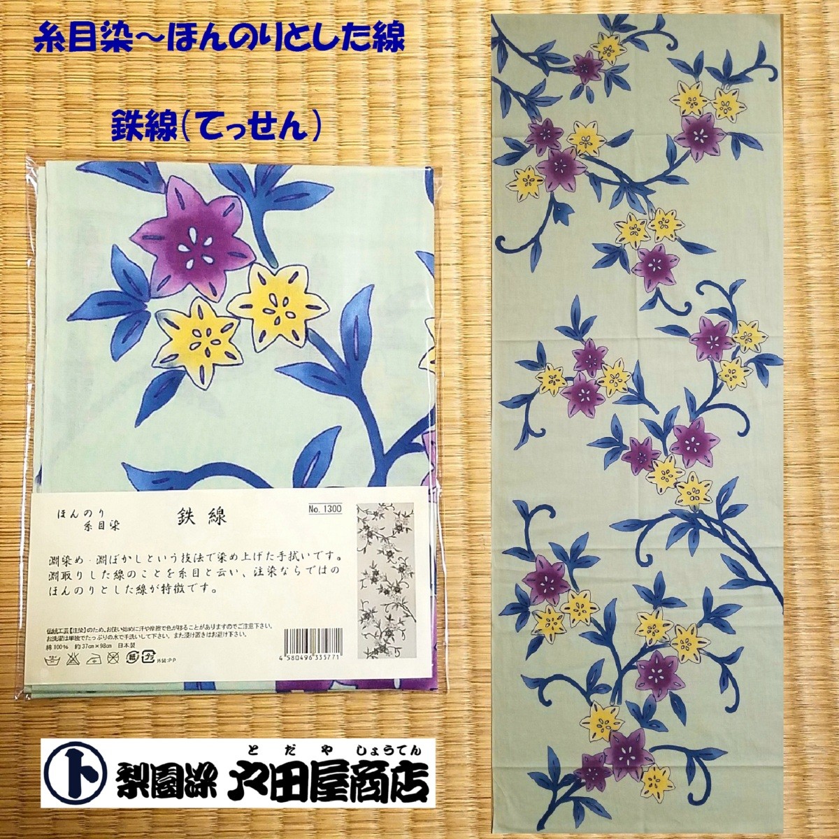 鉄で出来ているかのように強い事で知られ園芸家に人気があります。鉄線の清らかな美しさを特殊技法で染め上げました。