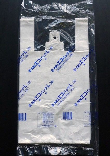 レジ袋(乳白・無地)になります。取りやすいエンボス加工になっています。ブロックシールが付いているのでフックなどに引っかけてお使いいただけます。