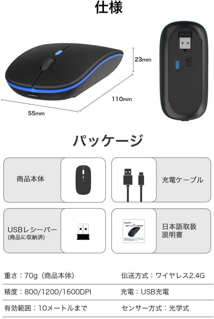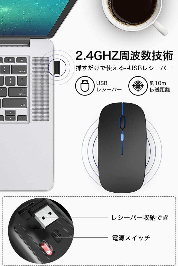商品概要【2.4G無線伝送/簡単操作】2.4GHz無線マウスに充電電池が内蔵されているので、通信範囲が半径10mの広範囲で安定したデータ通信が可能です。ドライバーインストルー不要、付属の接続端子をパソコンのUSB接続口に差し込むことで接続完了、ケーブルを気にせず使えるワイヤレスタイプです。ご注意:type-c端子は非対応です。