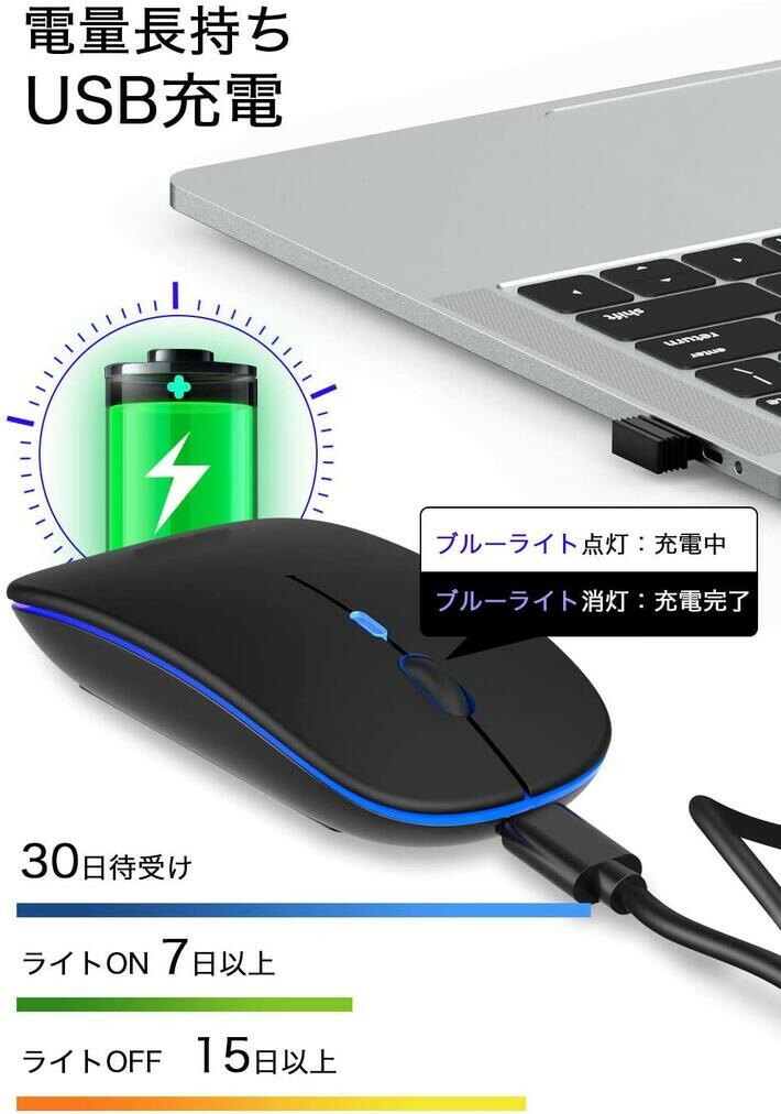 【長時間使用/節電モード】ワイヤレスマウス 充電式 なので、6時間のフル充電で15日以上連続使用可能!従来のワイヤレスマウスのような煩わしい電池交換が不要で、充電しながら使えます。長い日数の旅行でのご利用の際もご心配なく。15分間操作しないと、スマートスリープモードに入ります。