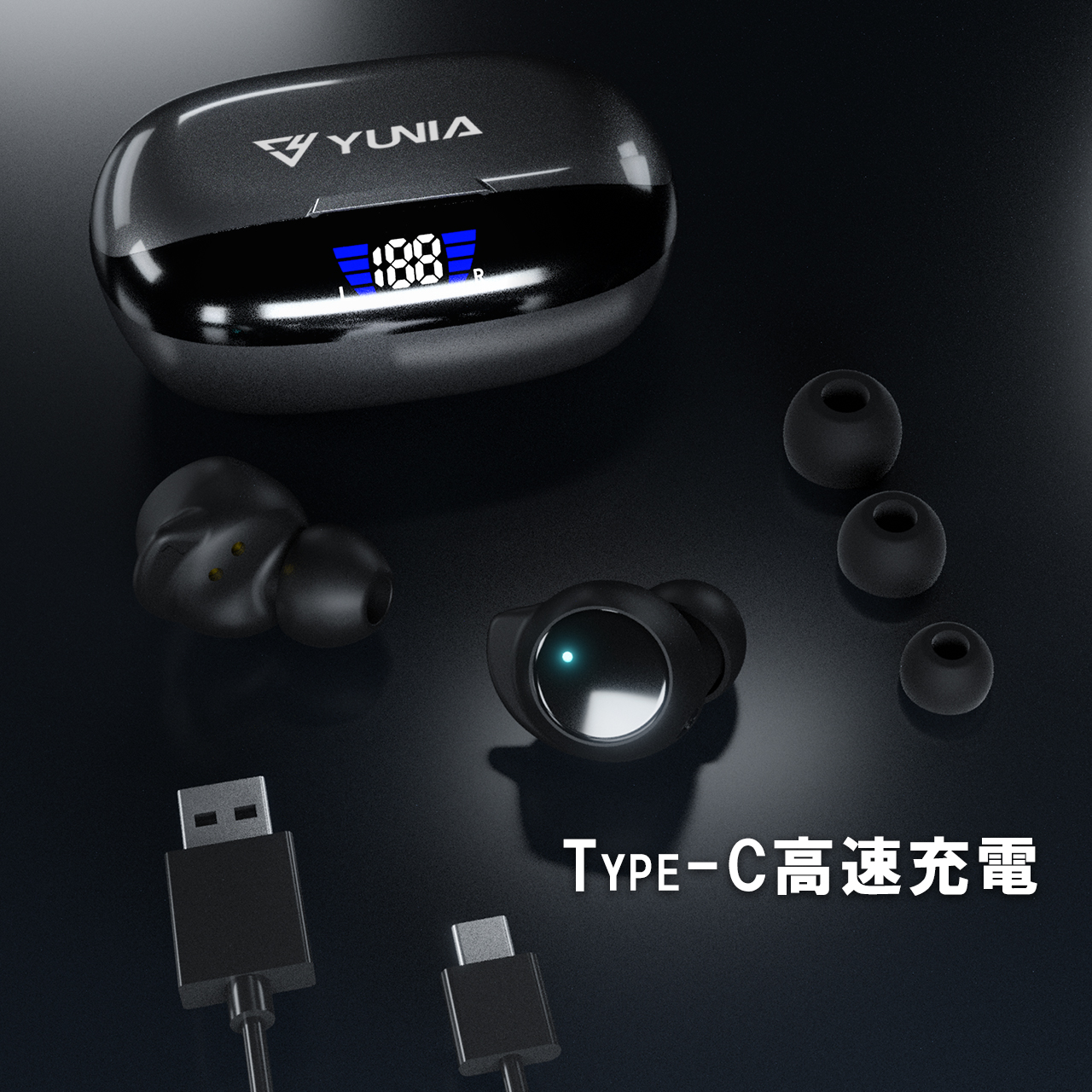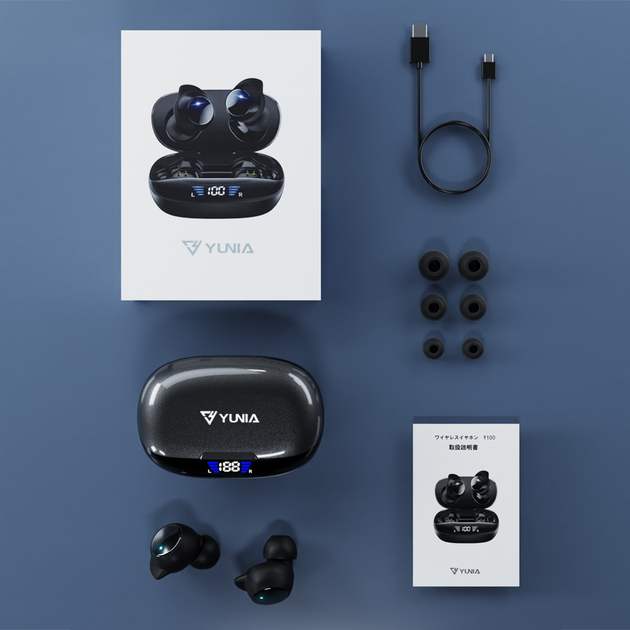 【パッケージ内容】化粧箱、イヤホン、充電ケース、TypeーC充電ケーブル、イヤホンキャップ×3、日本語取扱説明書