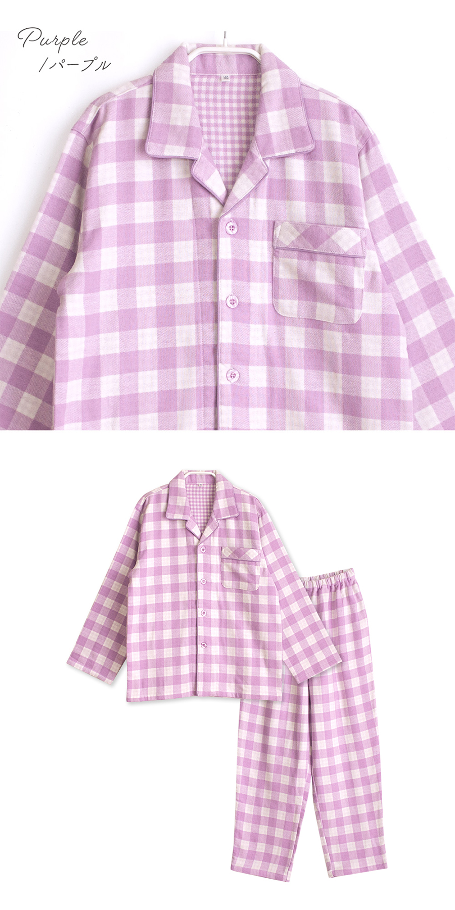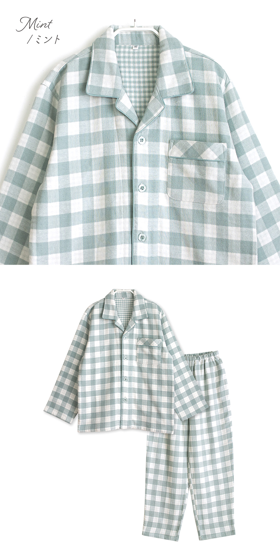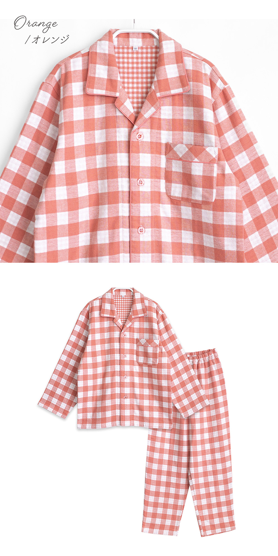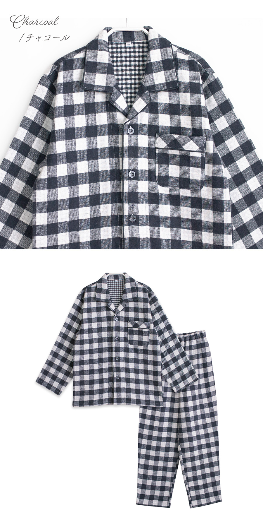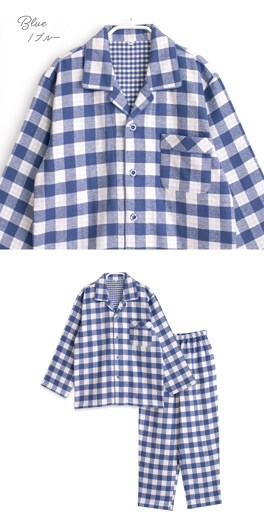 パジャマ キッズ 男の子 女の子 綿100% 長袖 冬 ふんわり柔らかい2枚仕立て 厚手 暖かい ダブルガーゼ 起毛 前開き シャツ ブロックチェック柄 おそろい
