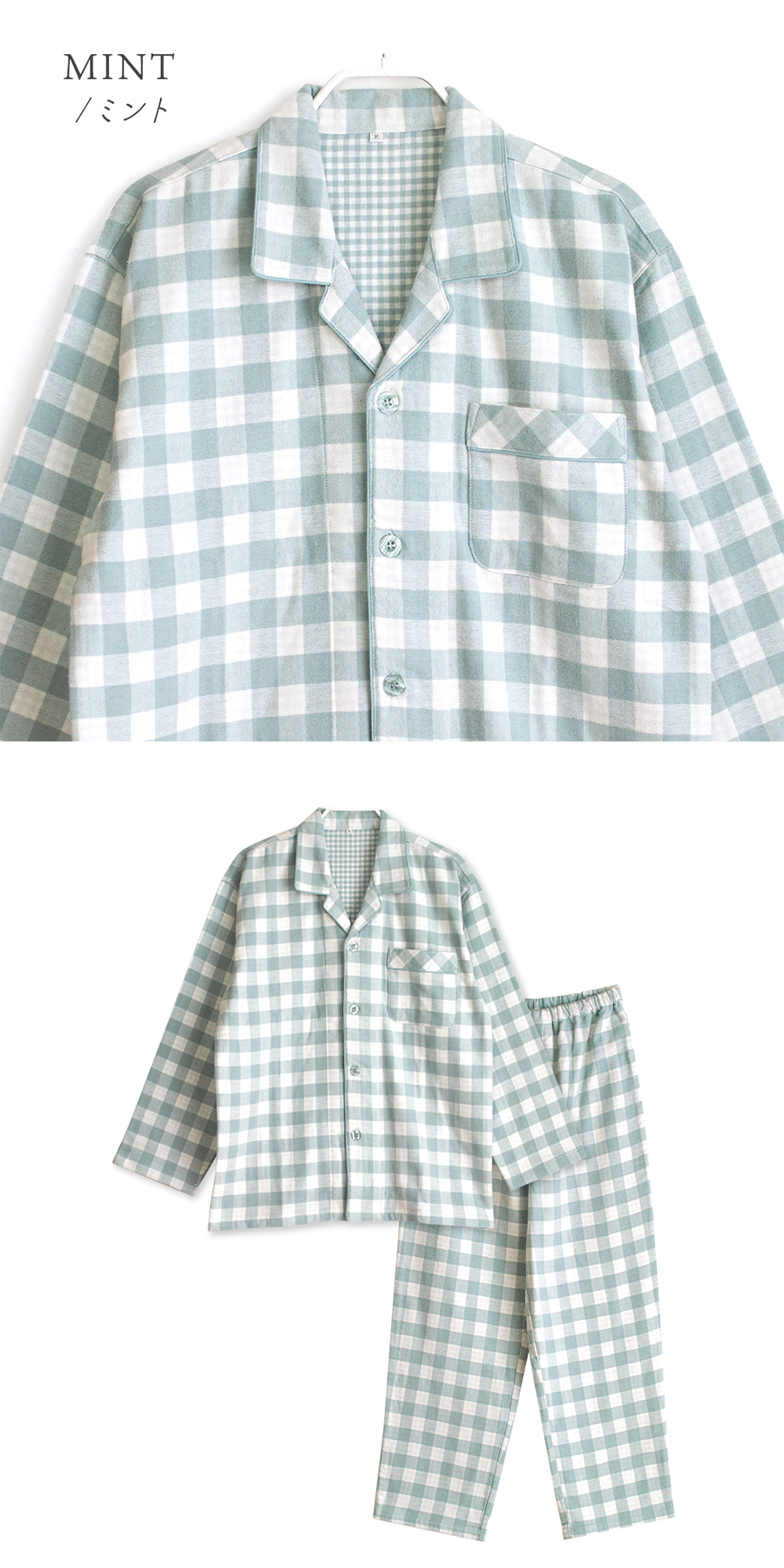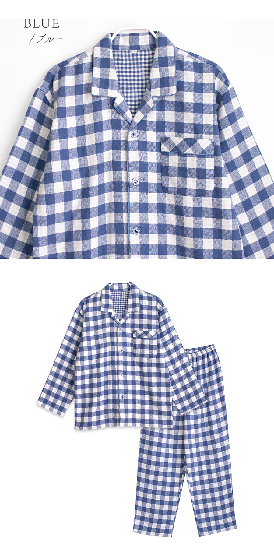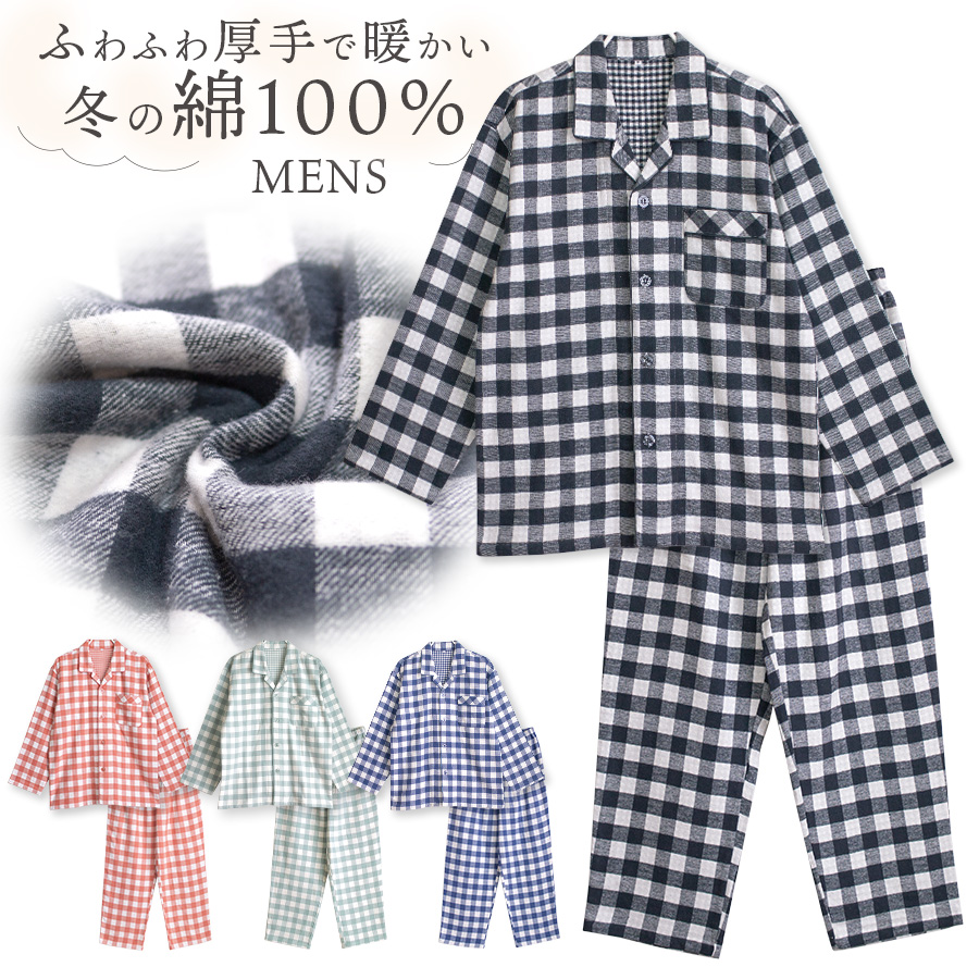 パジャマ メンズ 綿100% 長袖 冬 柔らかい2枚仕立て 厚手 暖かい ダブルガーゼ起毛 前開き ボタン シャツ ブロックチェック柄 おそろい 父の日 敬老の日