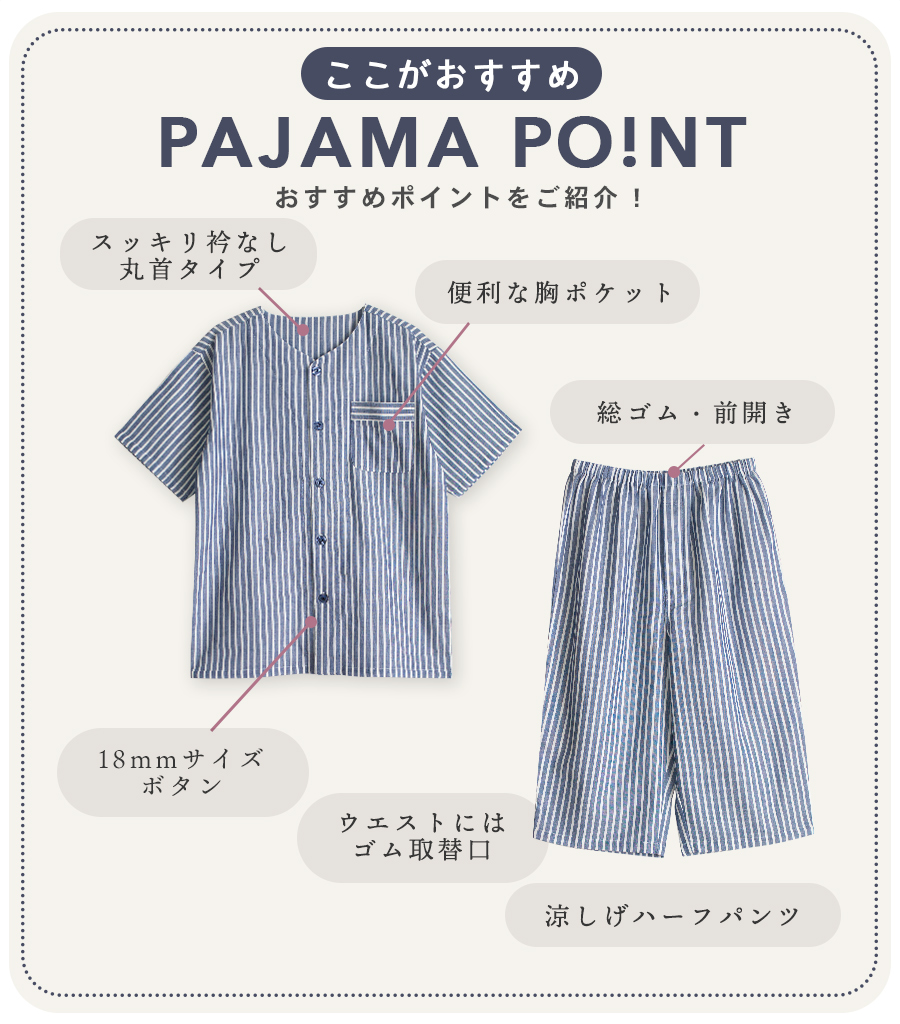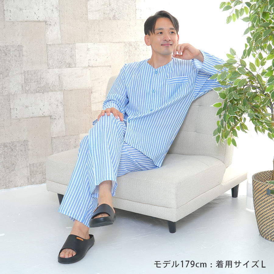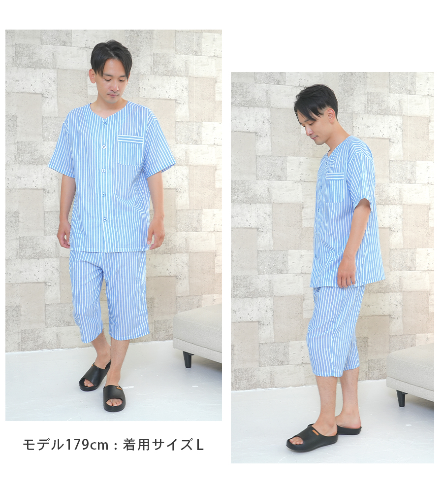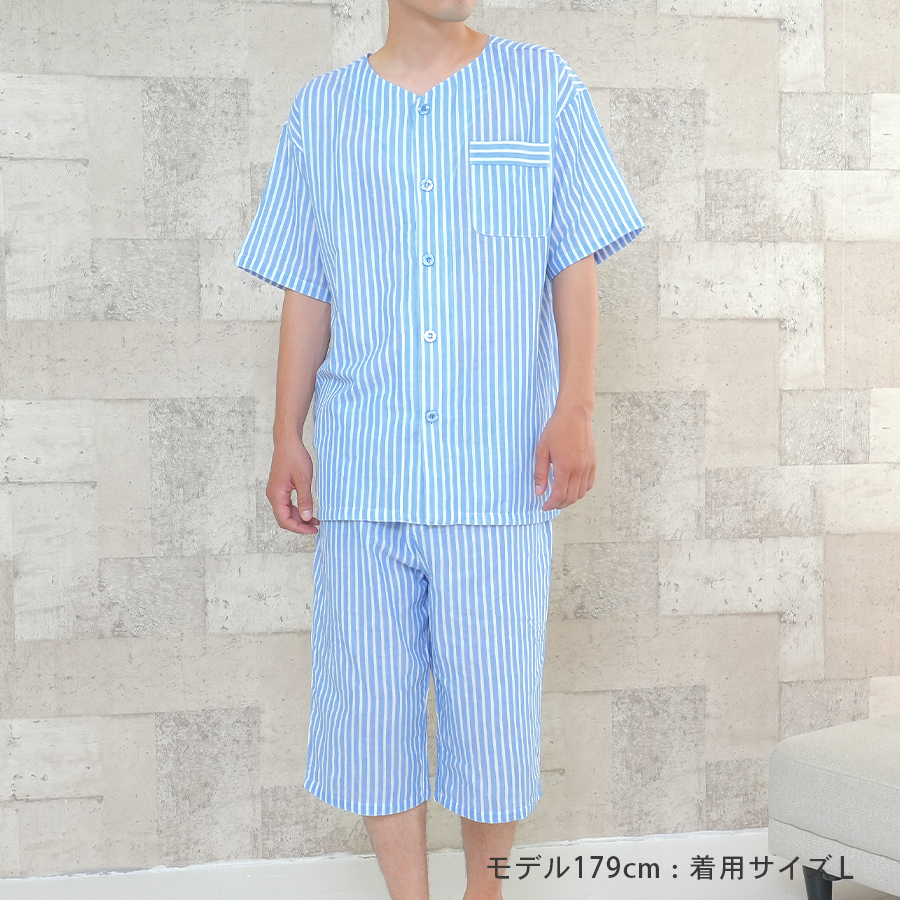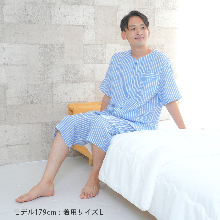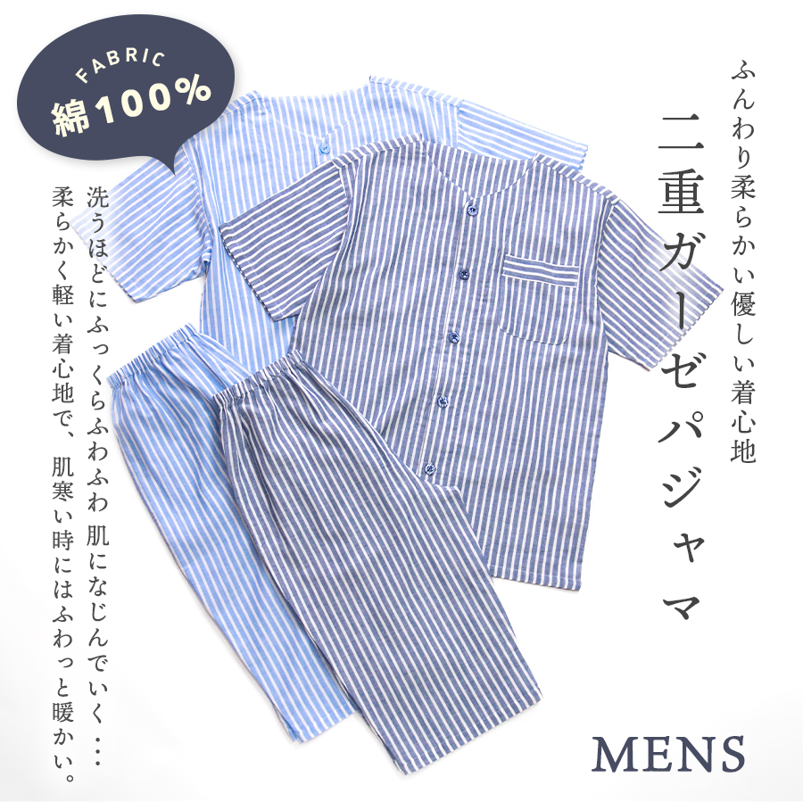 パジャマ メンズ 綿100%ダブルガーゼ 半袖 夏 前開き ボタン ストライプ 家族 親子 おそろい お客様 入院 父の日 敬老の日 紳士 二重ガーゼ