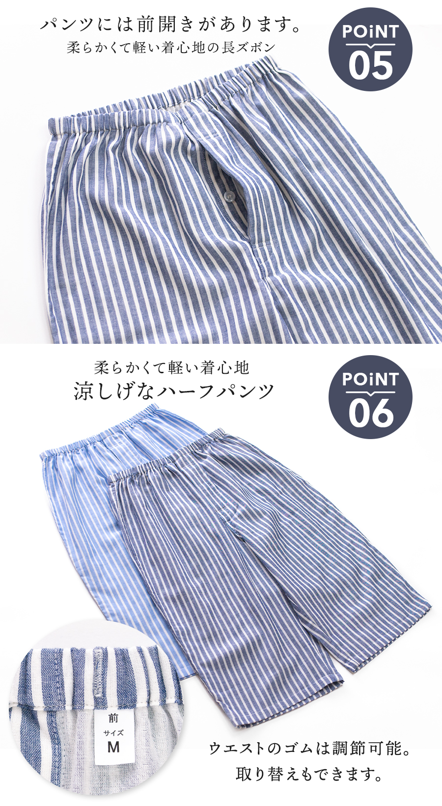 ■パンツ仕様 :ハーフパンツ/ウエスト総ゴム/前開き/ゴム取替口