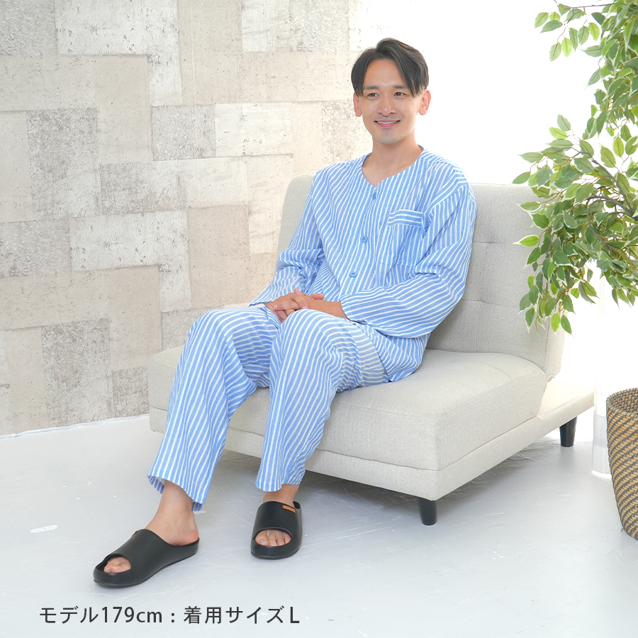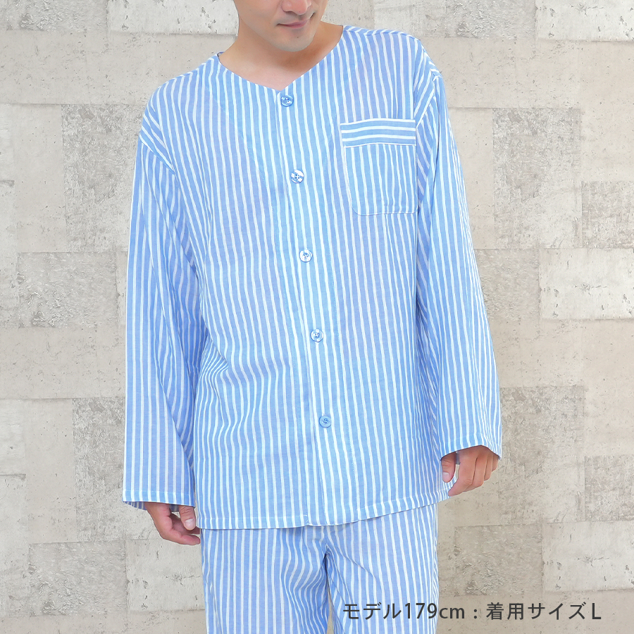 パジャマ メンズ 紳士 綿100% ダブルガーゼ 長袖 春 秋 前開き ボタン ストライプ 家族 親子 おそろい お客様 入院 父の日 敬老の日 紳士 二重ガーゼ