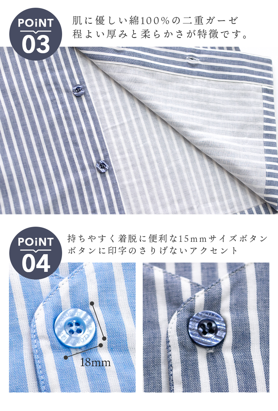 ■トップス仕様:長袖/丸首シャツ/前開き