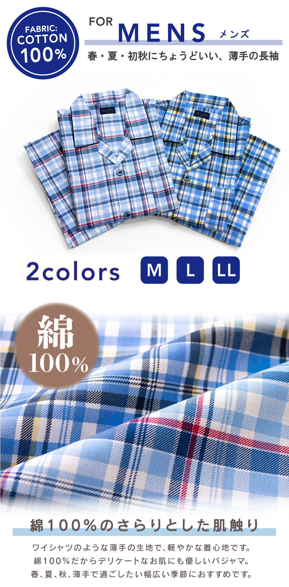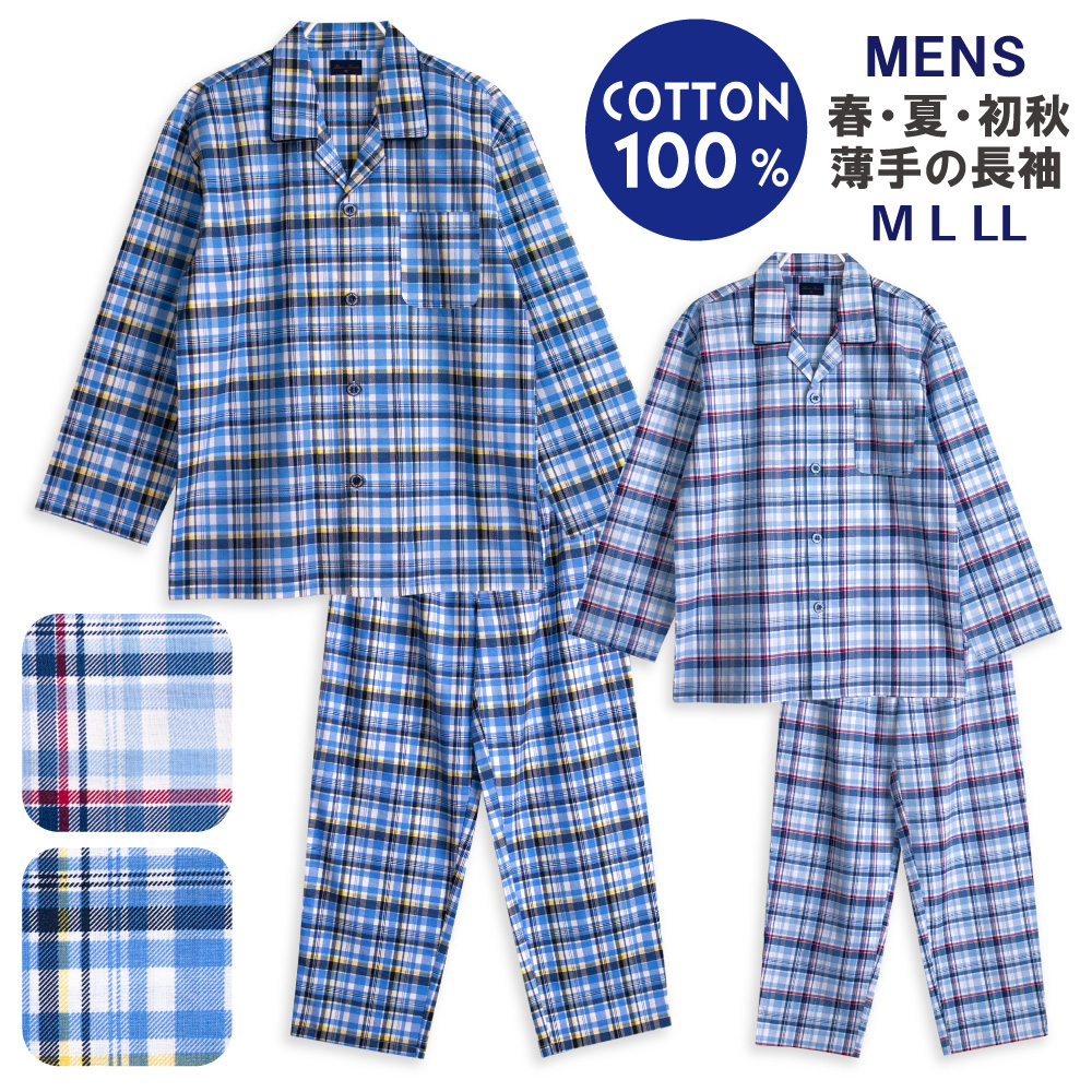 パジャマ メンズ 綿100% 長袖 春 夏 初秋 前開き ボタン チェック柄 薄手のシャツ M L LL おそろい プレゼント 父の日