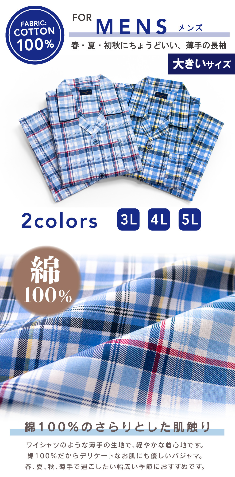大きいサイズ パジャマ メンズ 綿100% 長袖 春 夏 初秋 前開き ボタン チェック柄 薄手のシャツ 3L 4L 5L おそろい プレゼント 父の日