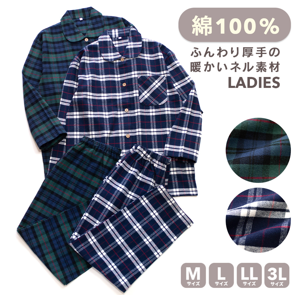 パジャマ レディース 綿100% 長袖 冬 前開き ボタン 厚手のネル起毛 先染め タータンチェック柄 M L LL 3L おそろい 敬老の日