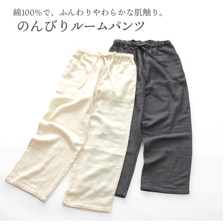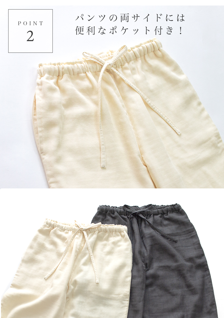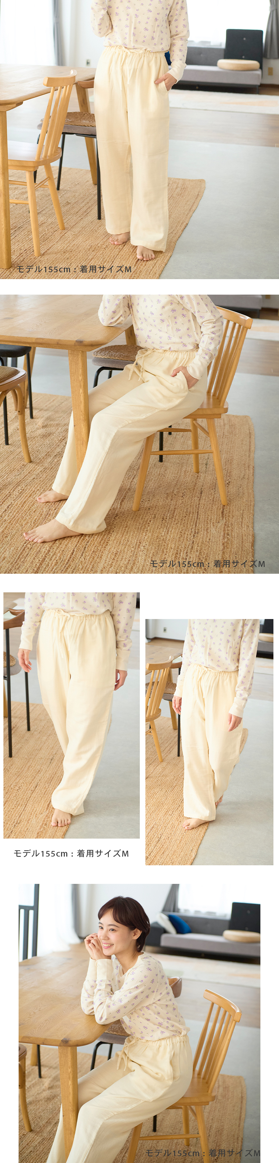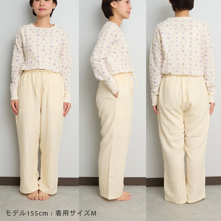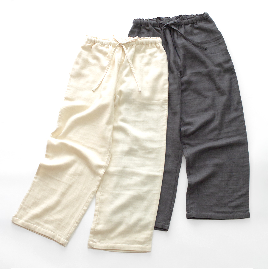 吸水性がよい綿100%のガーゼを3枚重ねて、1枚の生地にふっくらと仕上げたトリプルガーゼの単品ルームパンツです。