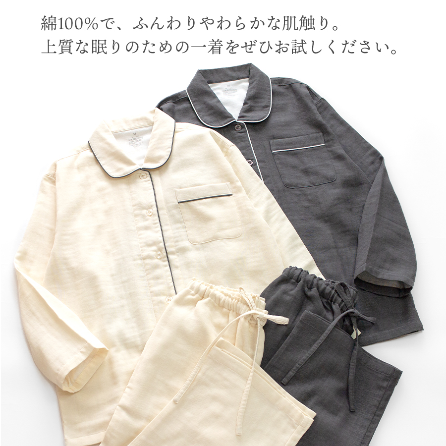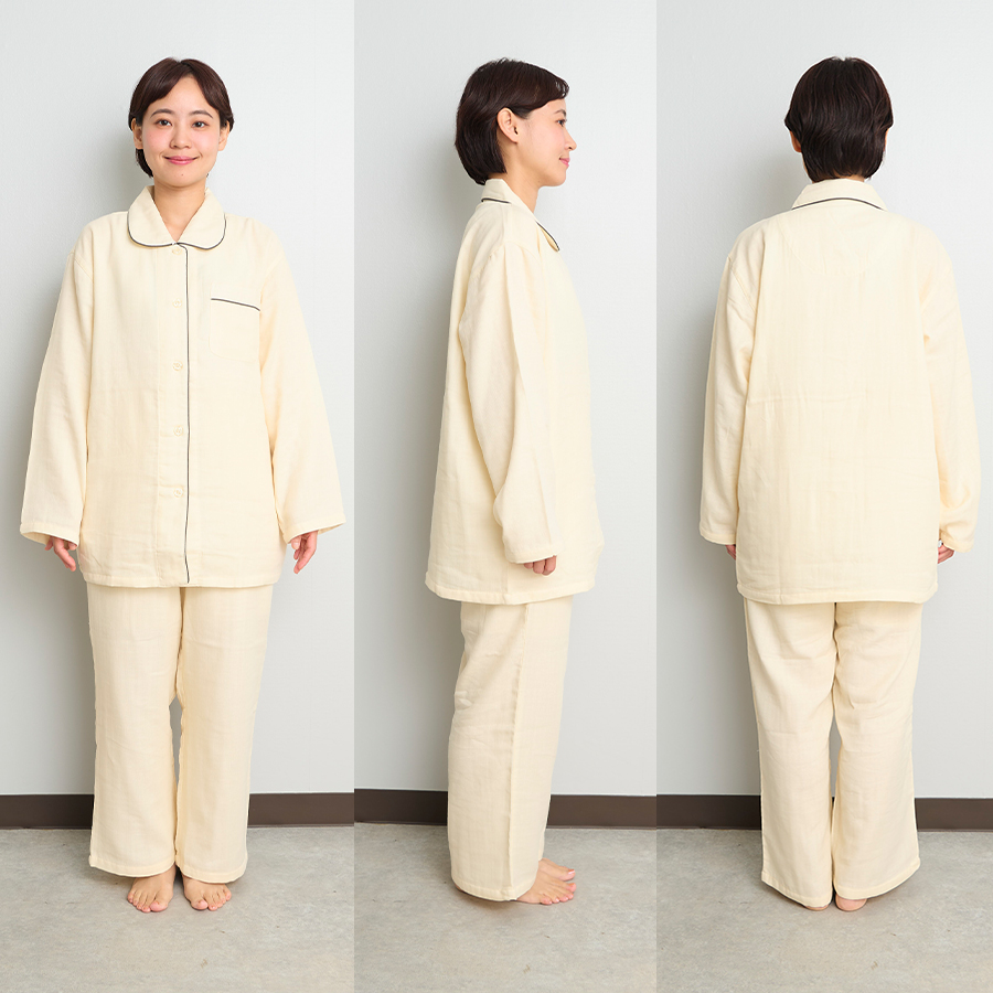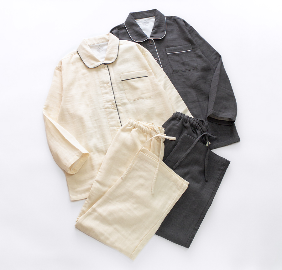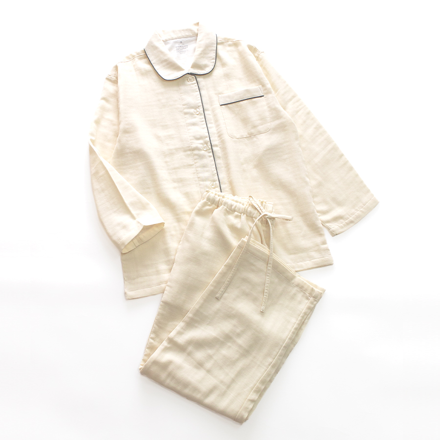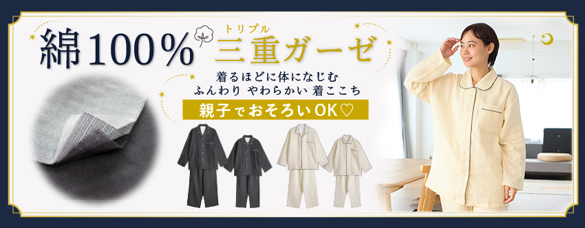 吸水性がよい綿100%のガーゼを3枚重ねて、1枚の生地にふっくらと仕上げたトリプルガーゼのパジャマです。