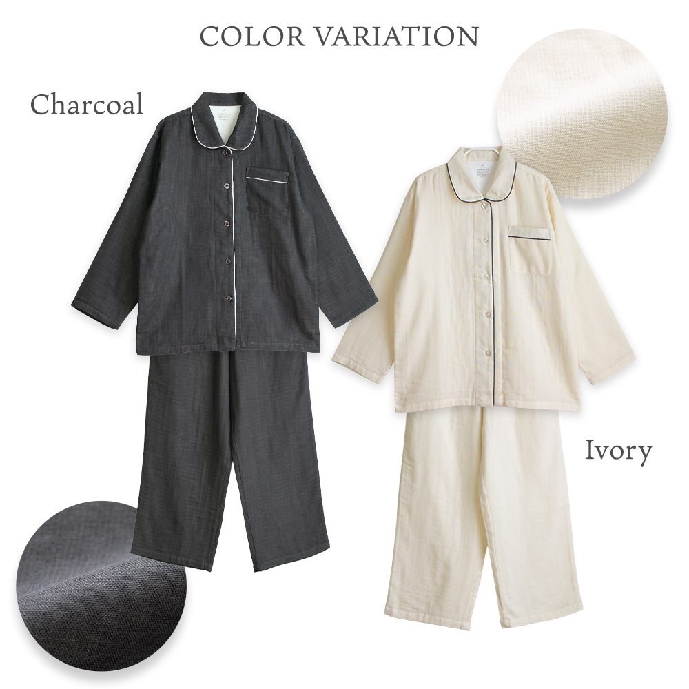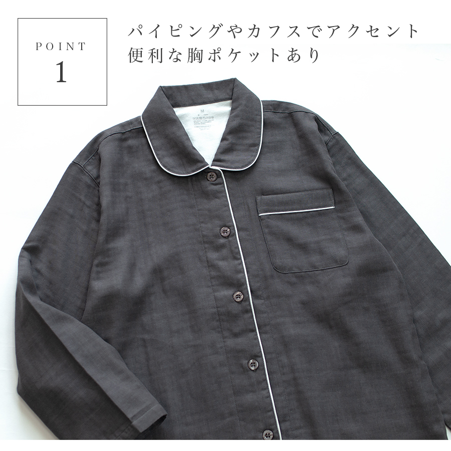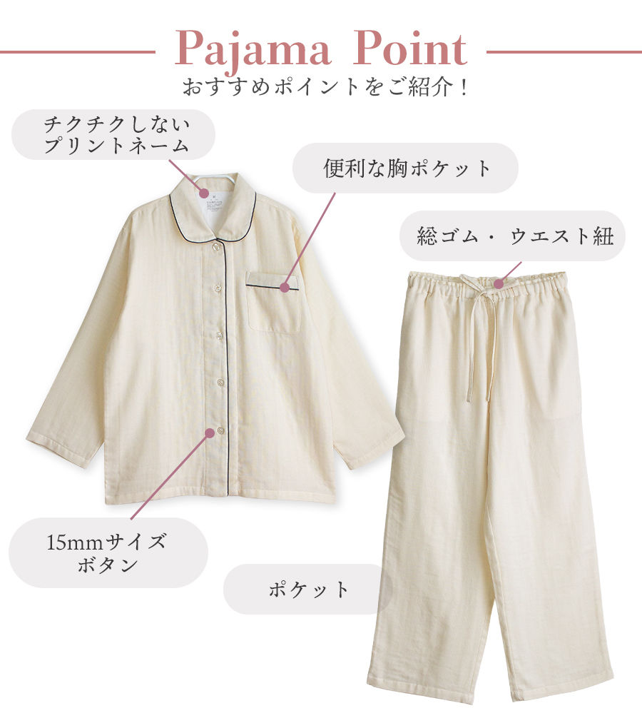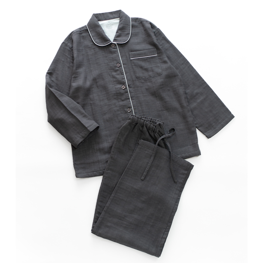吸水性がよい綿100%のガーゼを3枚重ねて、1枚の生地にふっくらと仕上げたトリプルガーゼのパジャマです。