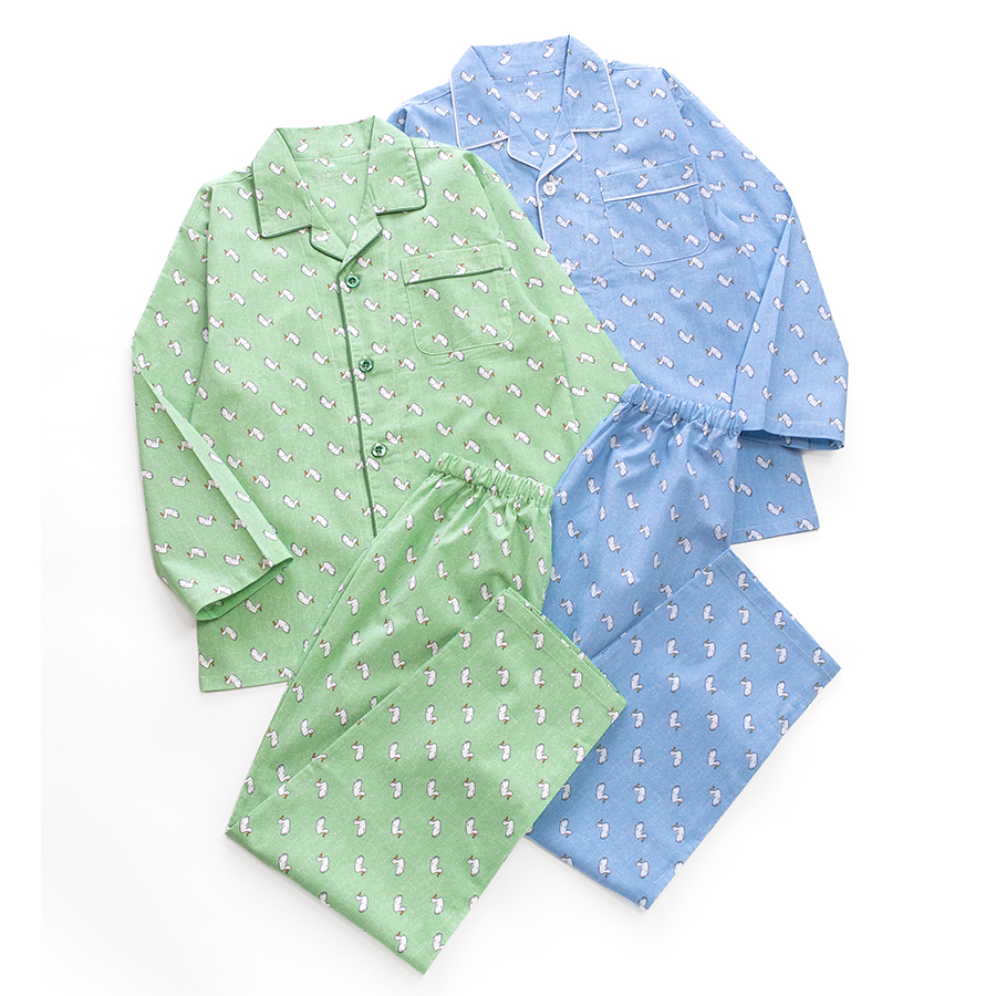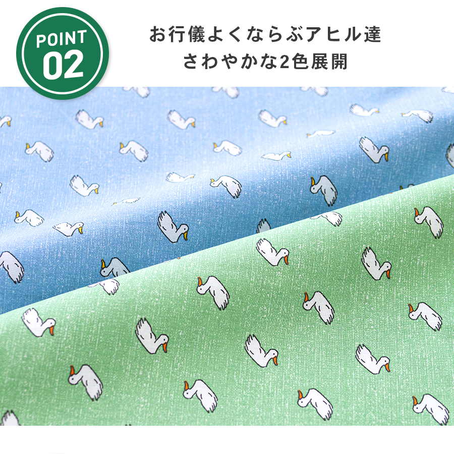 アヒルがお行儀よく並んだ子供とのお揃いが楽しい柄です。
