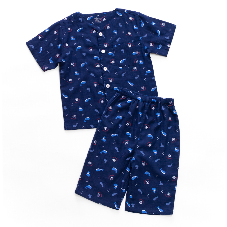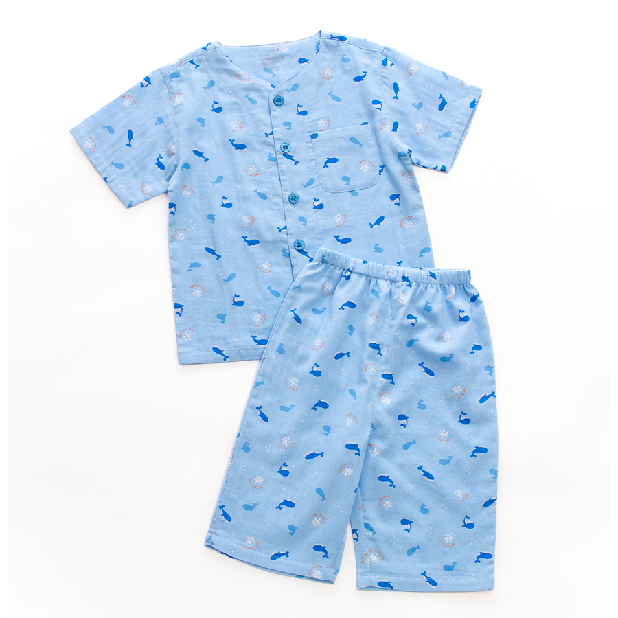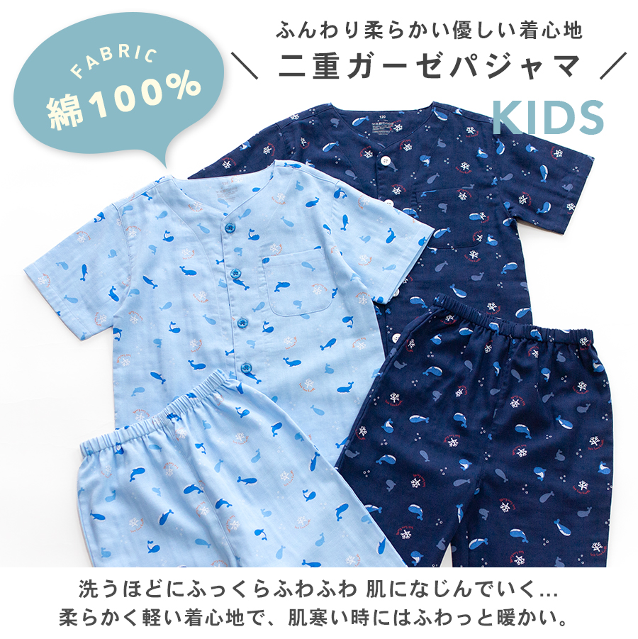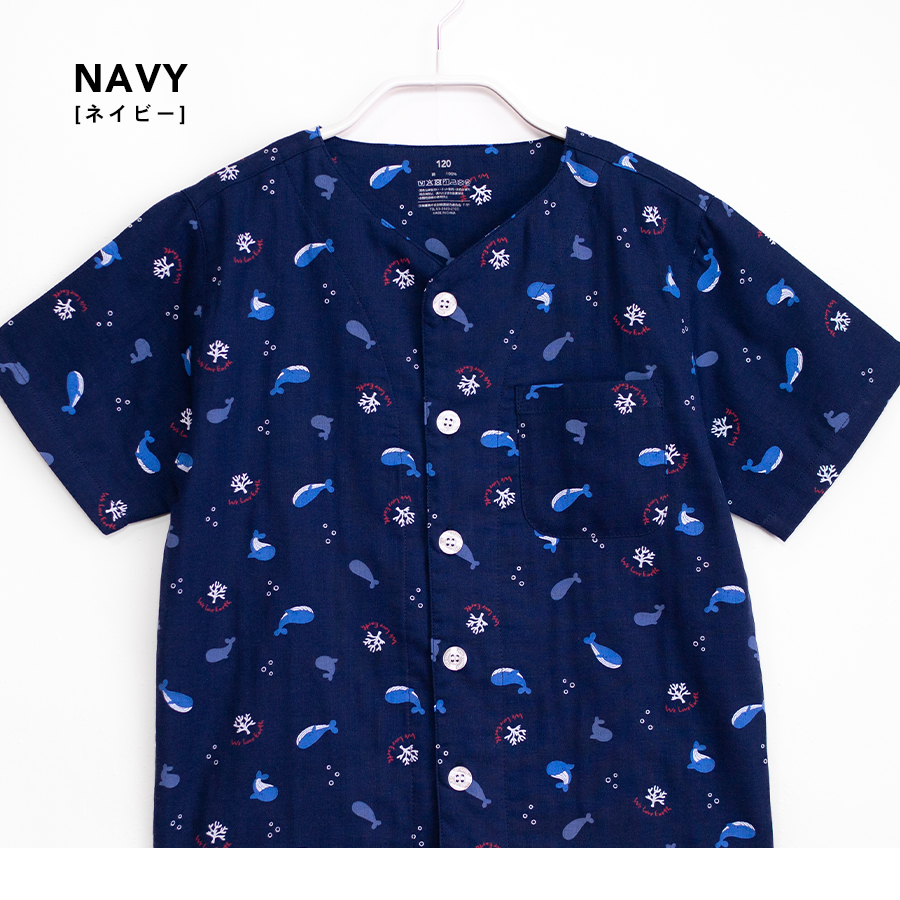 パジャマ キッズ 男の子 綿100% ダブルガーゼ 半袖 春 夏 前開き ボタン 丸首 シャツ くじら柄 130-160 家族 おそろい リンク コーデ