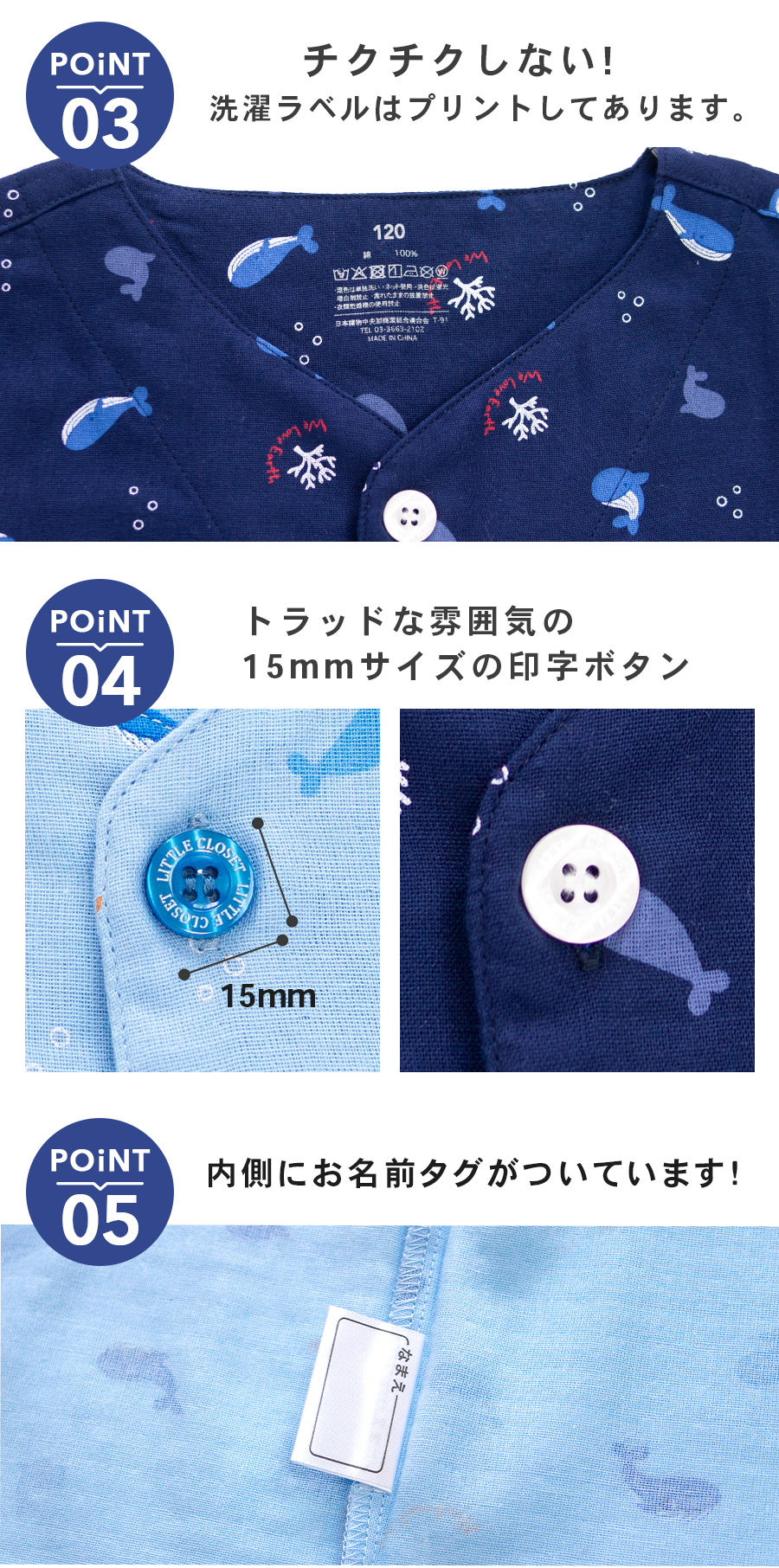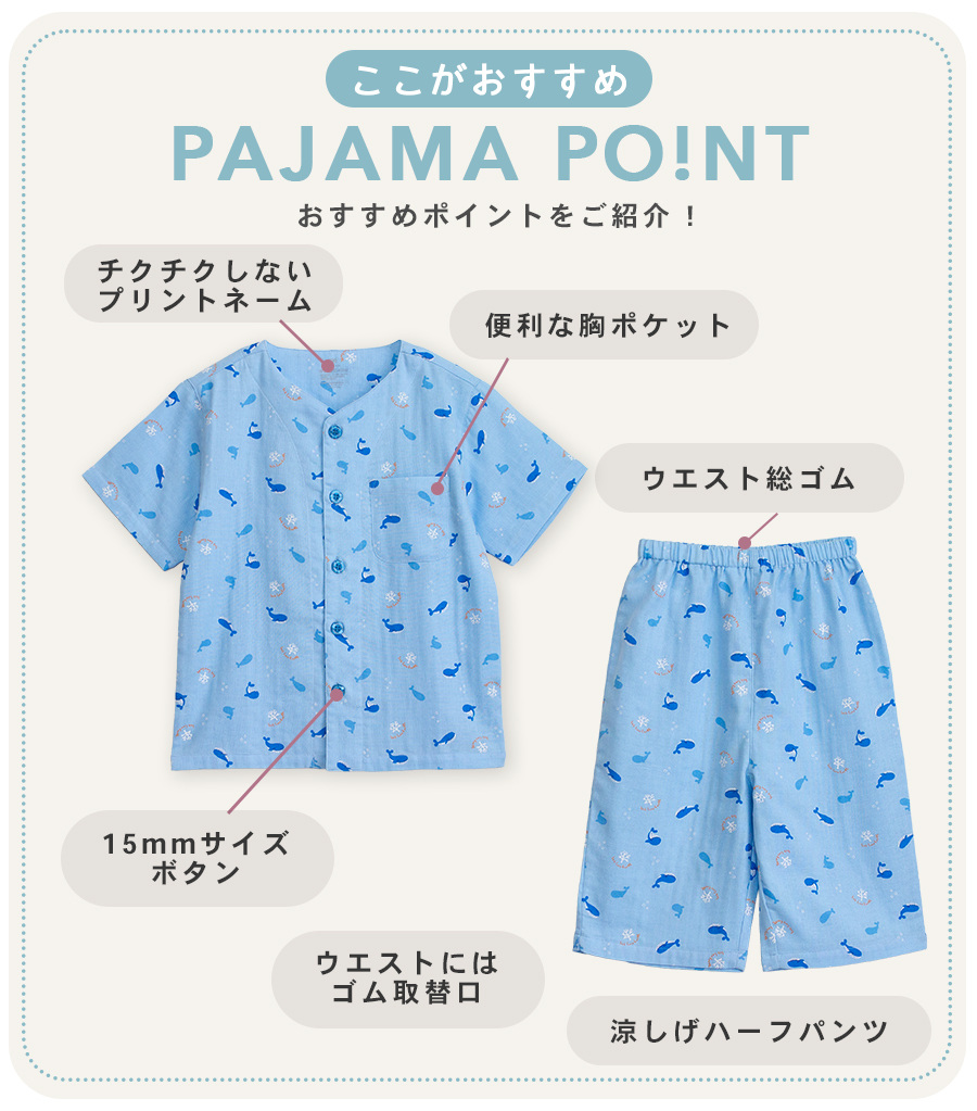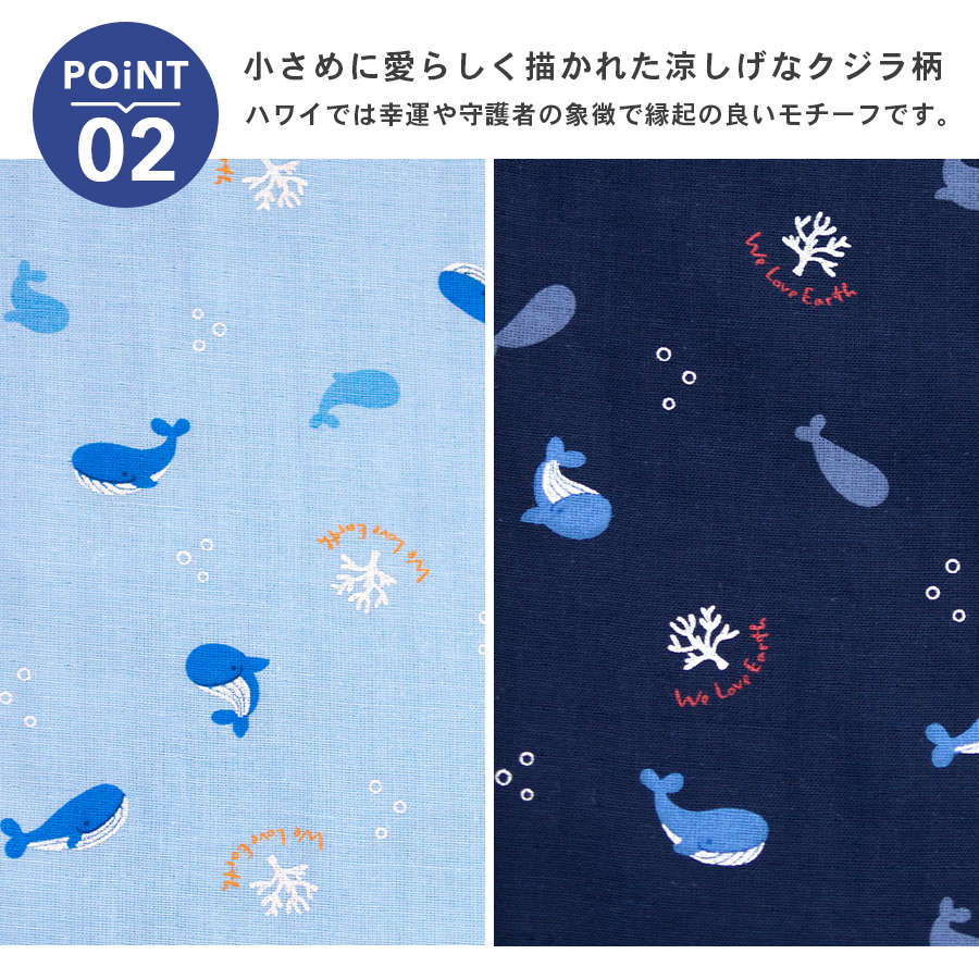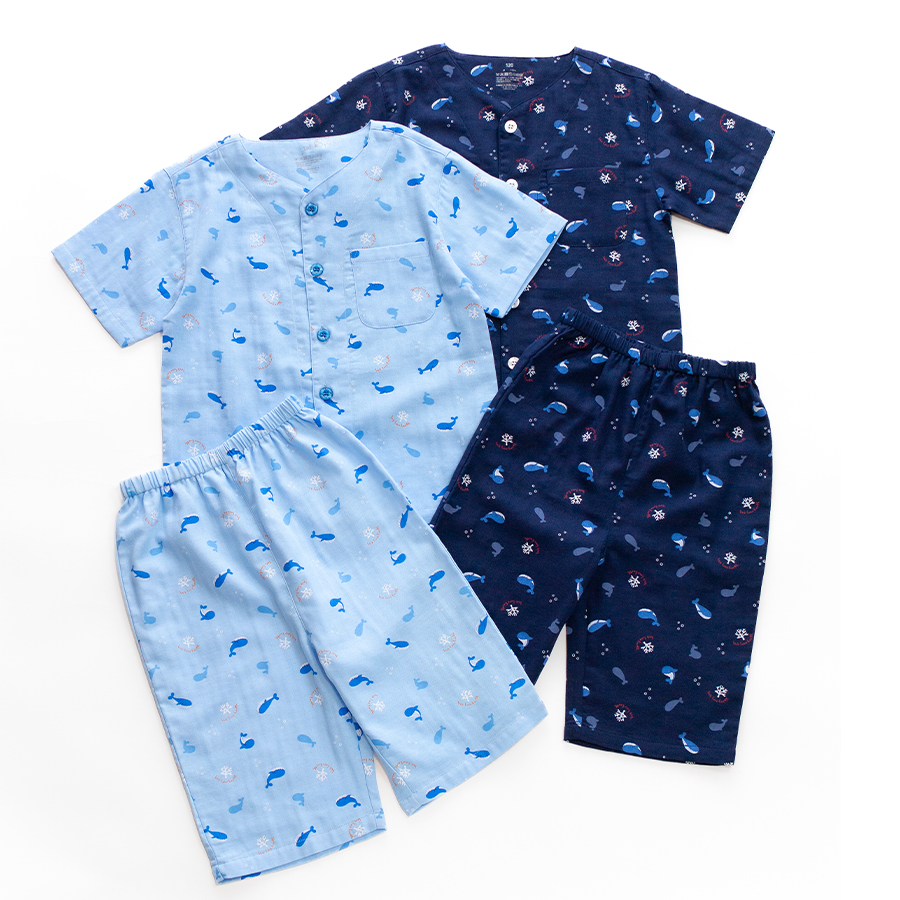 パジャマ キッズ 男の子 綿100% ダブルガーゼ 半袖 春 夏 前開き ボタン 丸首 シャツ くじら柄 130-160 家族 おそろい リンク コーデ