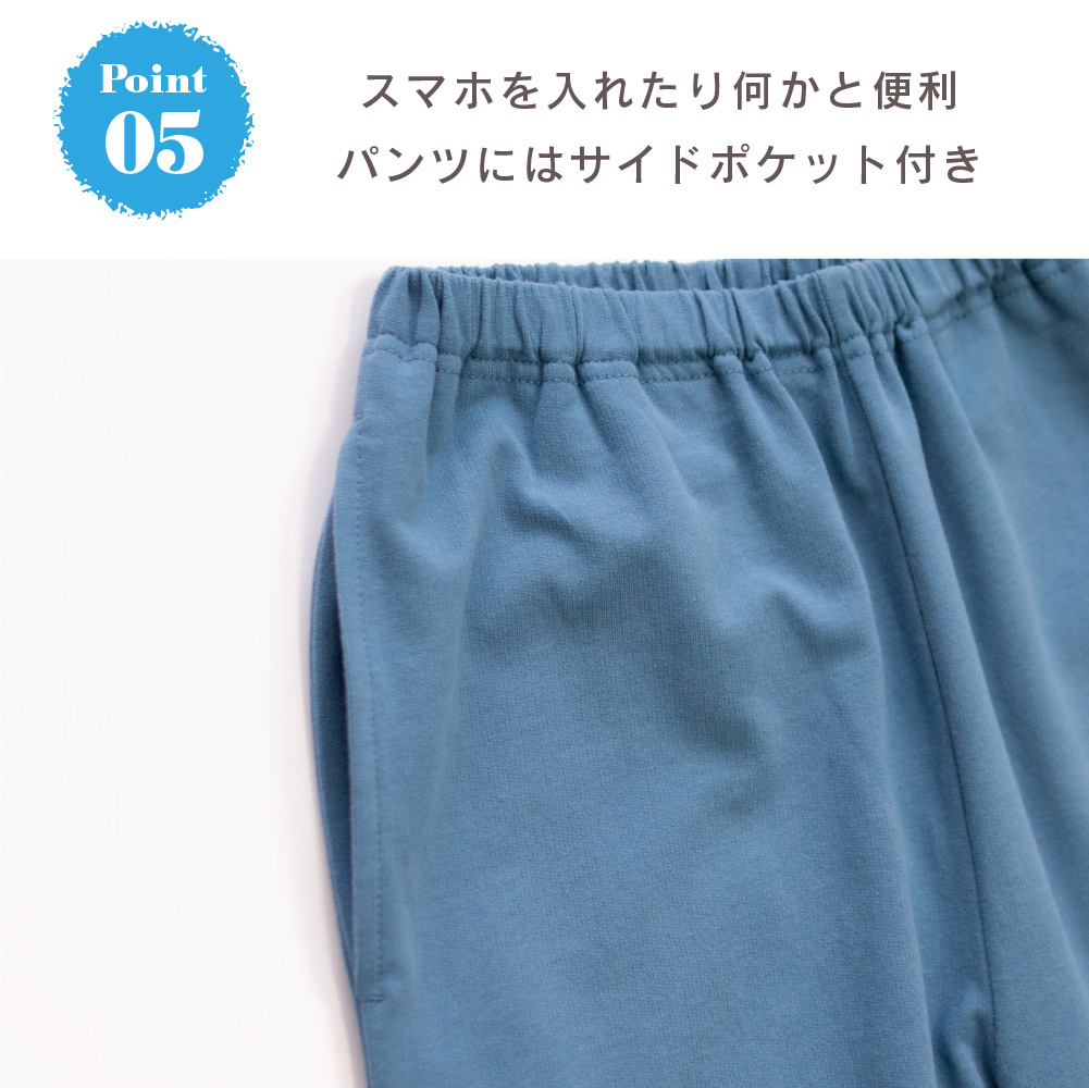 ●パンツ仕様 :長パンツ/裾口リブ/ウエスト総ゴム/両脇ポケット/ゴム取替口