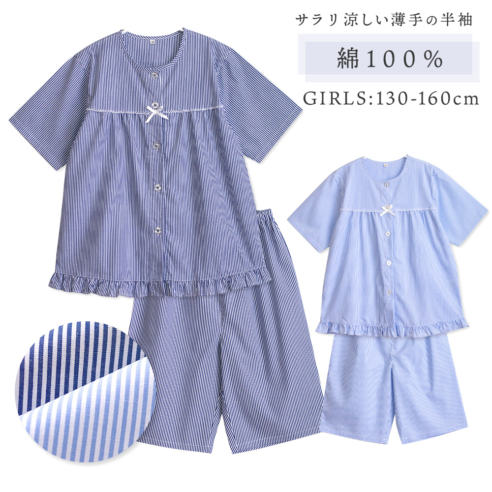 パジャマ キッズ 女の子 綿100% 半袖 春 夏 前開き ボタン 衿なしシャツ 裾フリル ストライプ 子供 ガールズ ジュニア おそろい メール便なら 送料無料 爆買