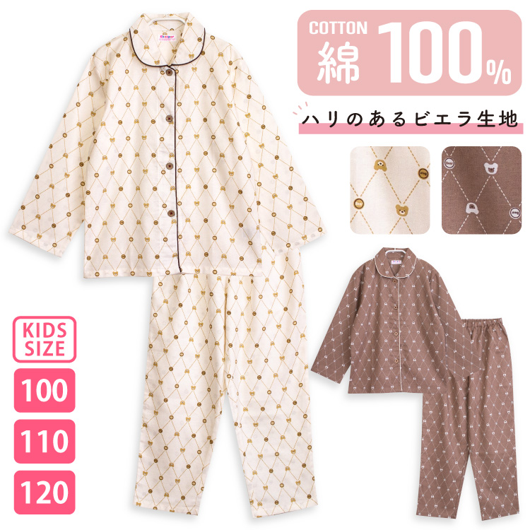 パジャマ キッズ 女の子 綿100% 長袖 春 秋 前開き ほのぼのモノグラム クマ柄 キャラメル モカ 100 110 120 おそろい メール便なら 送料無料