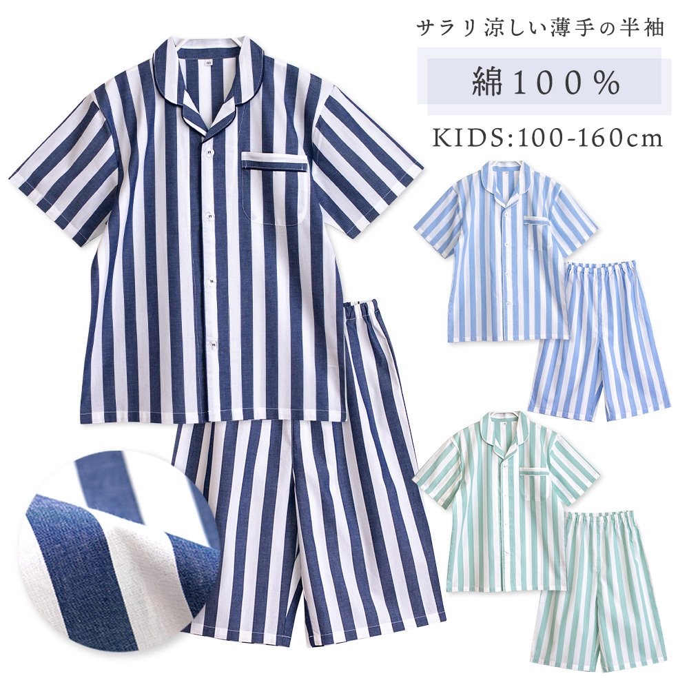 パジャマ キッズ 男の子 女の子 綿100% 半袖 春 夏 前開き ボタン ストライプ 先染め 子供 ボーイズ ガールズ ジュニア おそろい