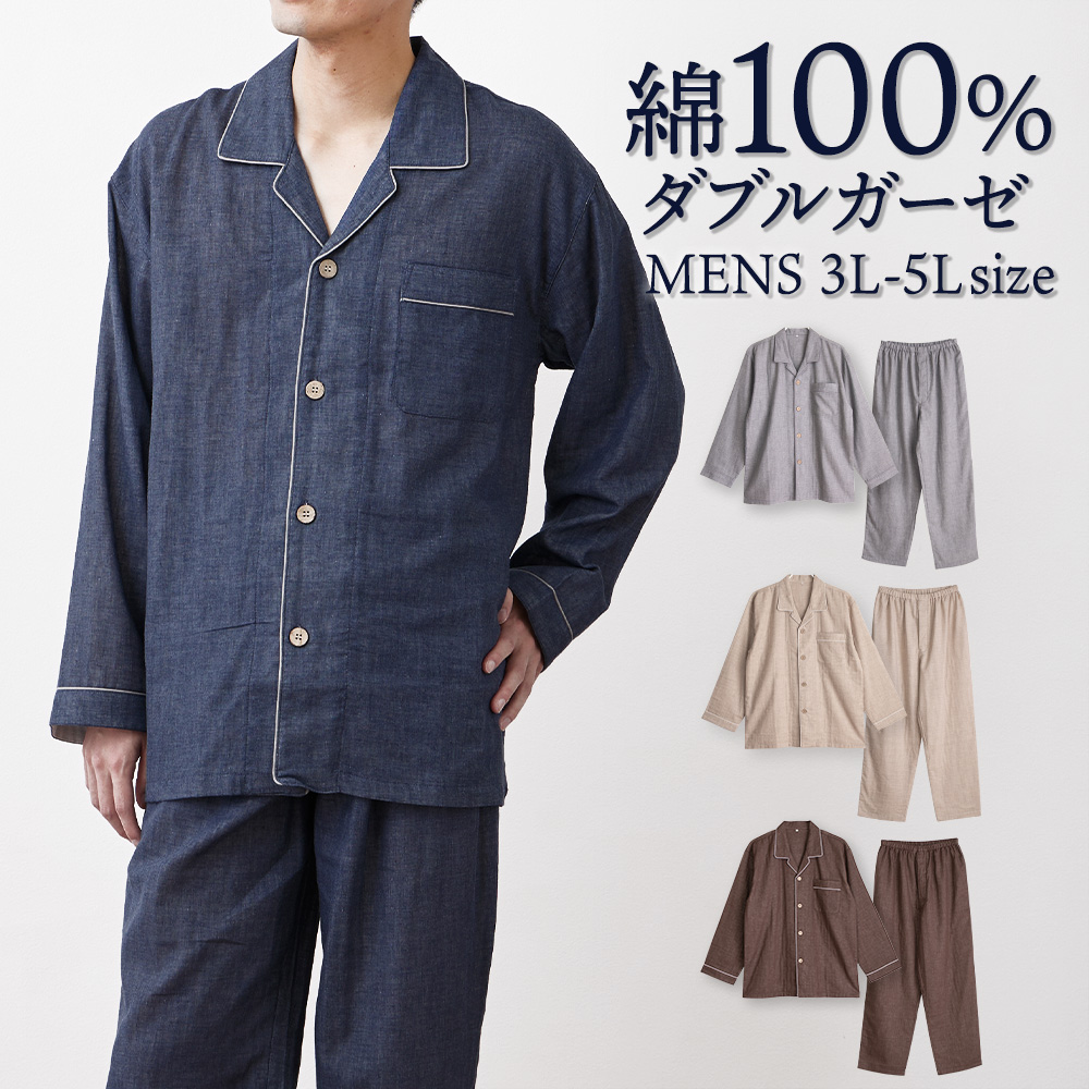 パジャマ メンズ 大きいサイズ 綿100% ダブルガーゼ 長袖 春 夏 初秋 前開き ボタン シャツ 無地 3L 4L 5L おそろい ペア プレゼント 父の日