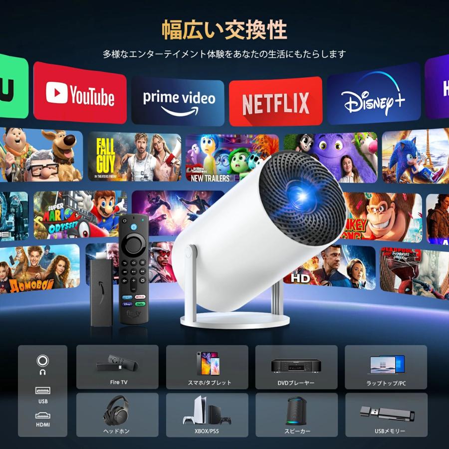 ノイズレベルは_25dBで、プレミアム放熱システムにより、静かな映画鑑賞環境を保証します。このスマートムービープロジェクターはHDMI、USB、オーディオポートを備えており、ノートパソコン、テレビスティック、USBディスクなどと互換性があります。