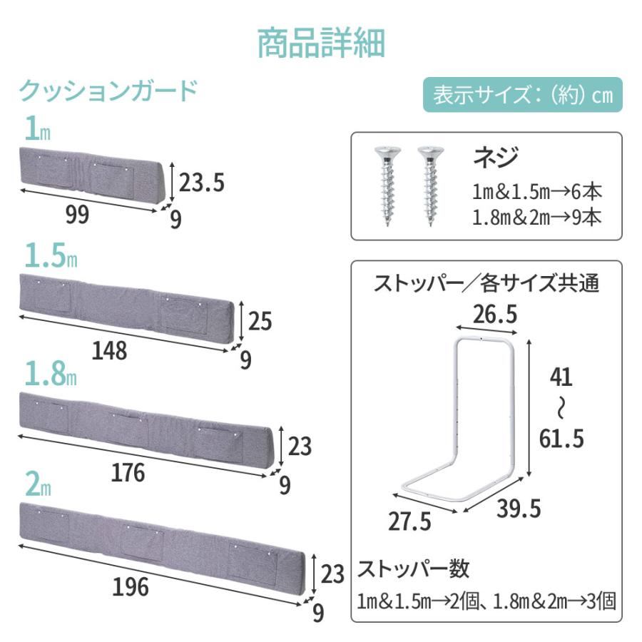 ストッパー数:2個(1m、1.5m)、3個(1.8m、2m)