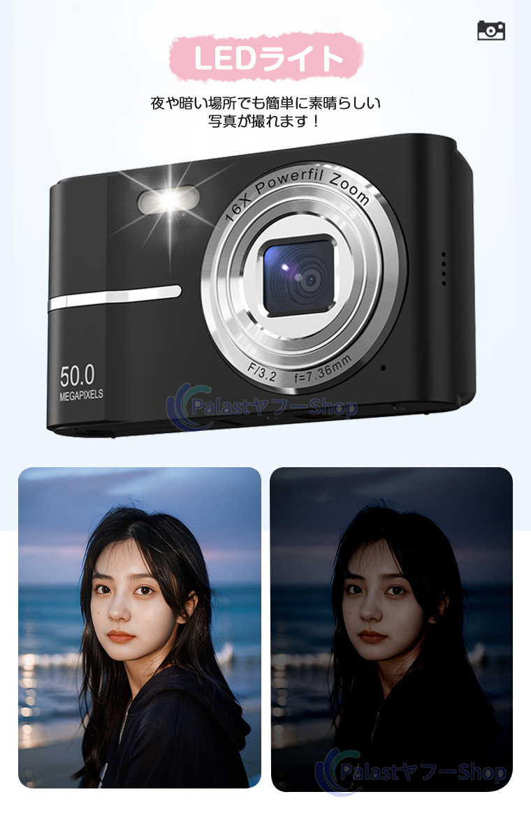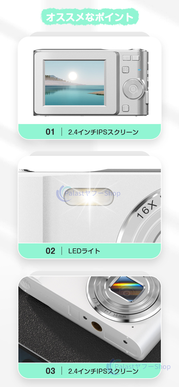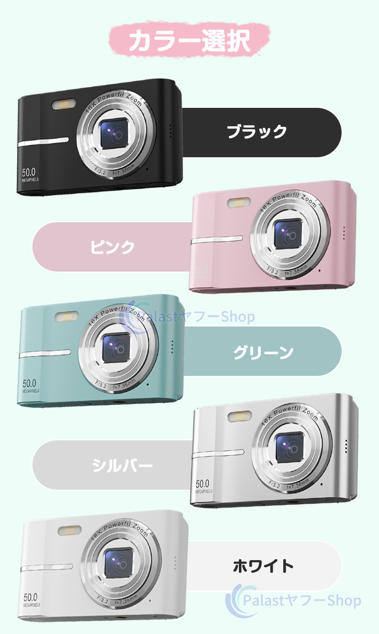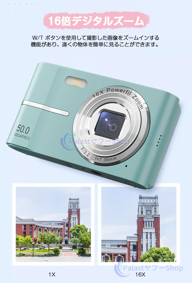 16倍デジタルズーム採用のカメラだから、遠く離れた被写体でも、撮りたい細部まで拡大して撮影できます。当店のコンパクデジカメはウェブカメラ、顔検出、連続撮影、笑顔検出、手ぶれ補正、ビューティファンクション、ワイトバランス、自動オフ、日付/時間表示などが設定でき、豊富な機能が持っているデジカメです。多くの写真フィルタを搭載して、家族写真、運動会、卒業式、忘年会、旅行、イベント、いろいろな場合で大活躍します。