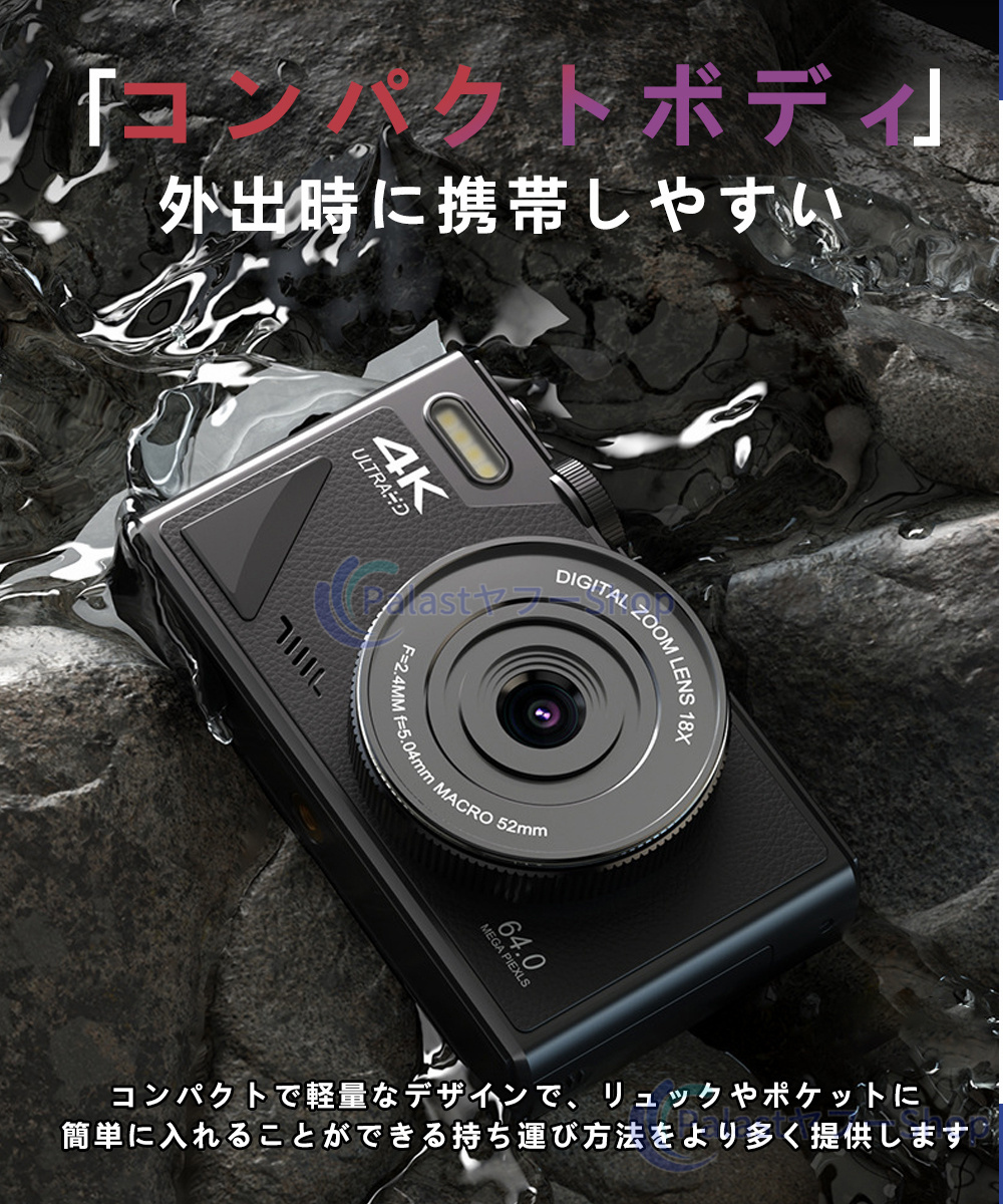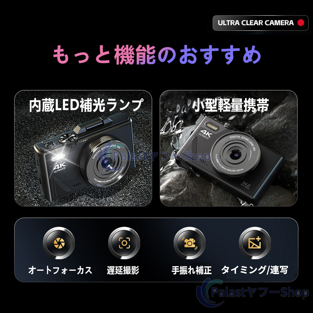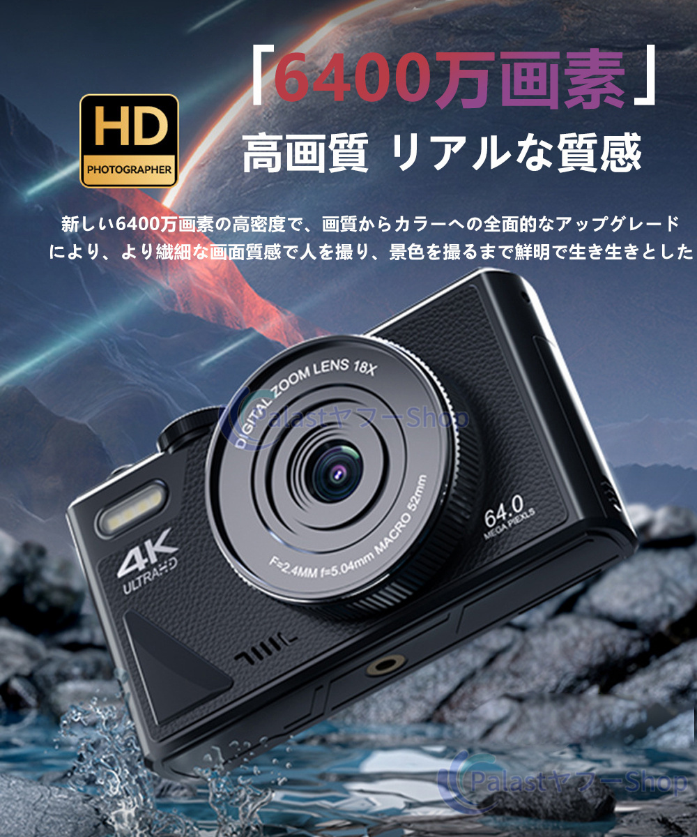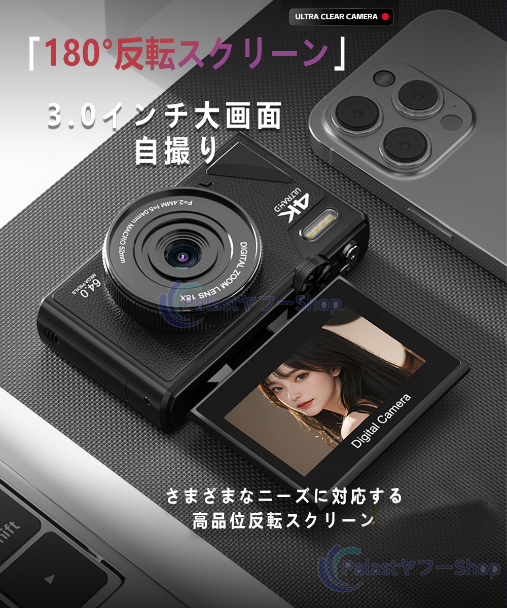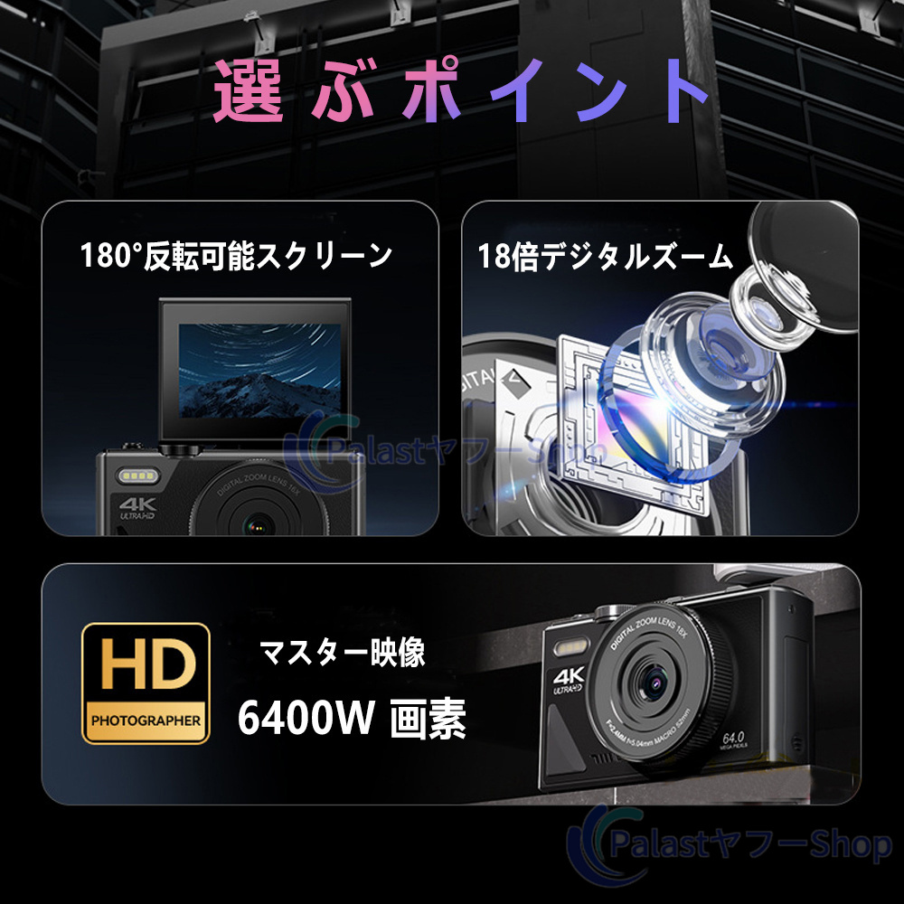 デジタルカメラ 4K wifi対応 6400万画素 小型 18倍ズーム 3.0インチ 大画面 180°回転 動画撮影 オートフォーカス 携帯便利 修学旅行 初心者 手振れ補正 誕生日