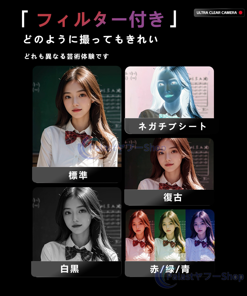 手ぶれ補正、ウェブカメラ、連続撮影、ビューティファンクション、ホワイトバランス、自動オフ、日付/時間表示などが設定でき、豊富な機能が持っています。また、多くの写真フィルタを搭載して、想像力と創造力を十分に発揮できます。