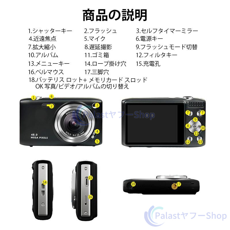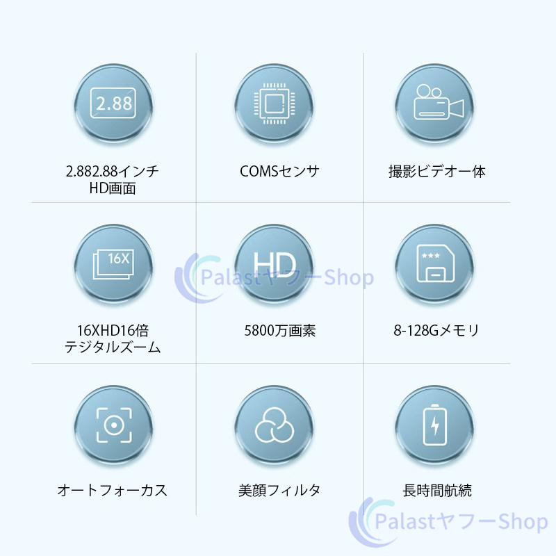 商品情報 イメージセンサ:CMOSセンサ8.0メガピクセル ファイル形式:JPEG(静止画)/AVI(ビデオ) 外部ストレージ:SDカード(最大128 GB) 液晶ディスプレイ:IPS HD 2.8インチ液晶ディスプレイ レンズ:F 3.0 f=7.45 ズーム:16 Xデジタルズーム マイク台:サポート 写真の撮り方の:右手にあるシャッターボタン 美顔効果:サポート ろしゅつじかん:-3.0 EV ~+3.0 EV ホワイトバランス:自動、日光、曇り、白熱光、蛍光 ISO:自動/100/200/400 シーン:自動/夜間人物像/夜景/人物像/風景/ビーチ/高感度 付属品:カメラ本体*1 USBケーブル*1 800mahのバッテリー*1 収納袋*1 PDF日本語説明書*1