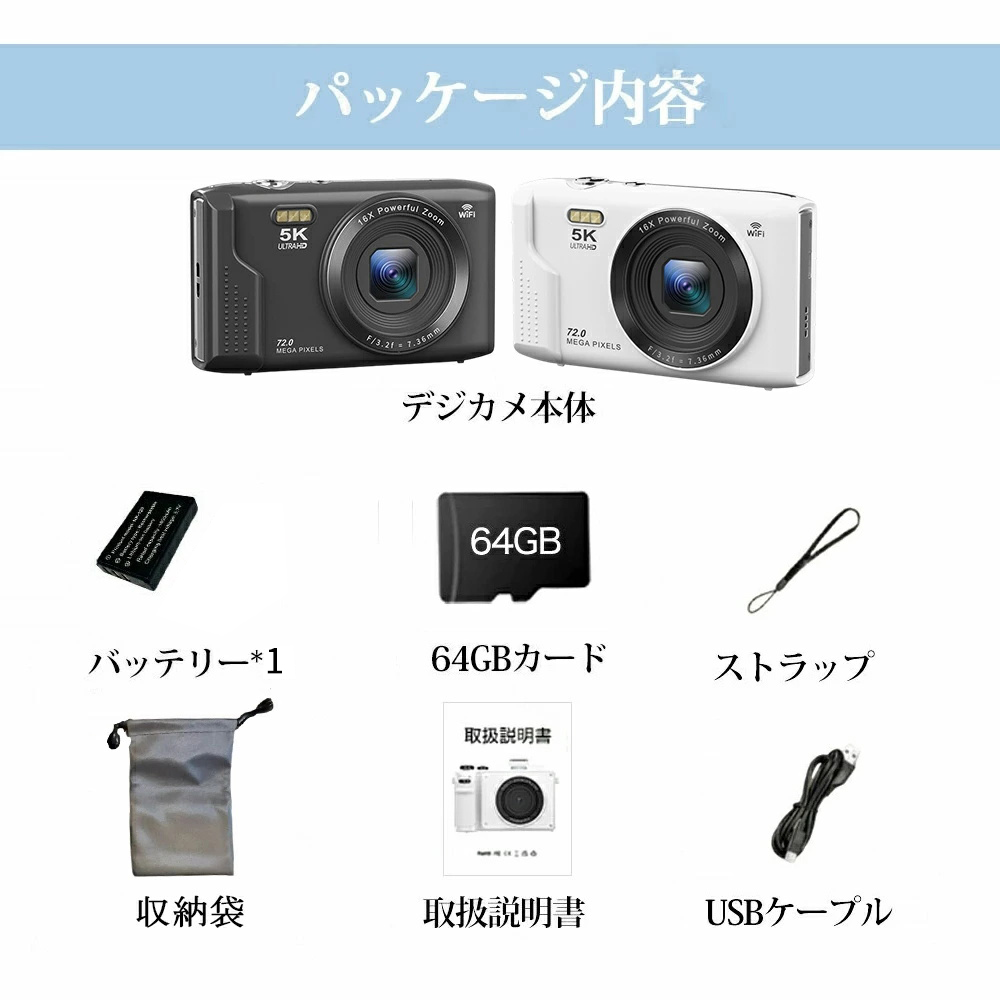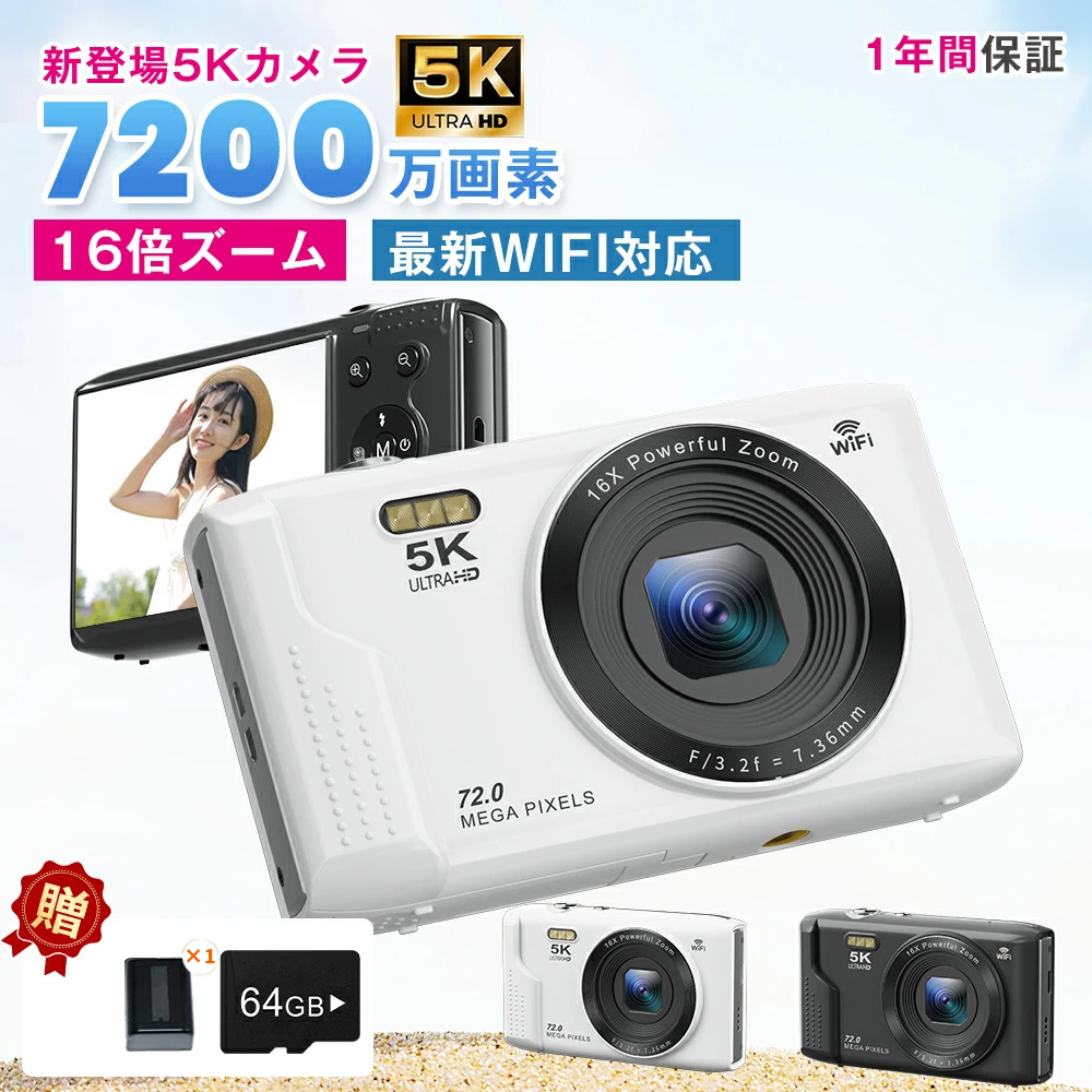 デジカメ デジタルカメラ 5K 7200万画素 16倍ズーム 軽量 高画質 WiFi機能 ビデオカメラ オートフォーカス 手振れ補正 IPS大画面 軽量 新品 安い 旅行 修学旅行