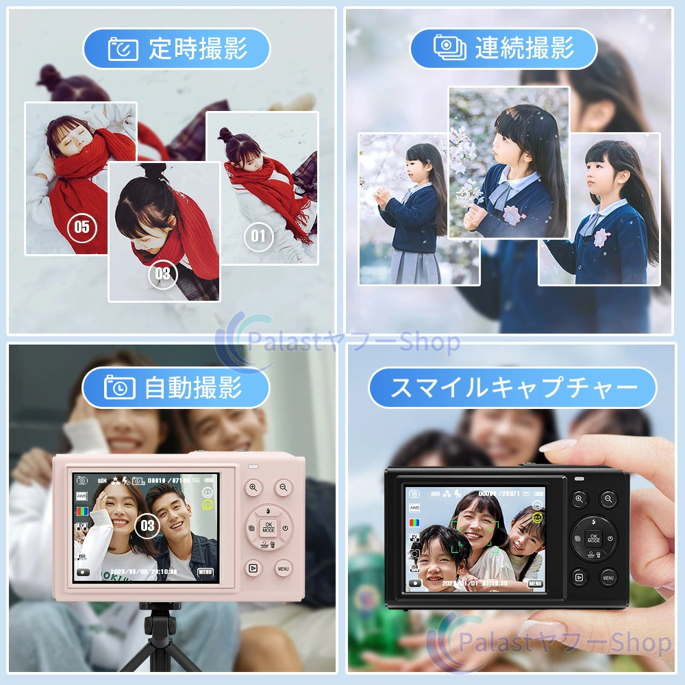 定時撮影/連続撮影/自動撮影/タイムラプス/スローモーション/ループ録画/一時停止機能搭載。