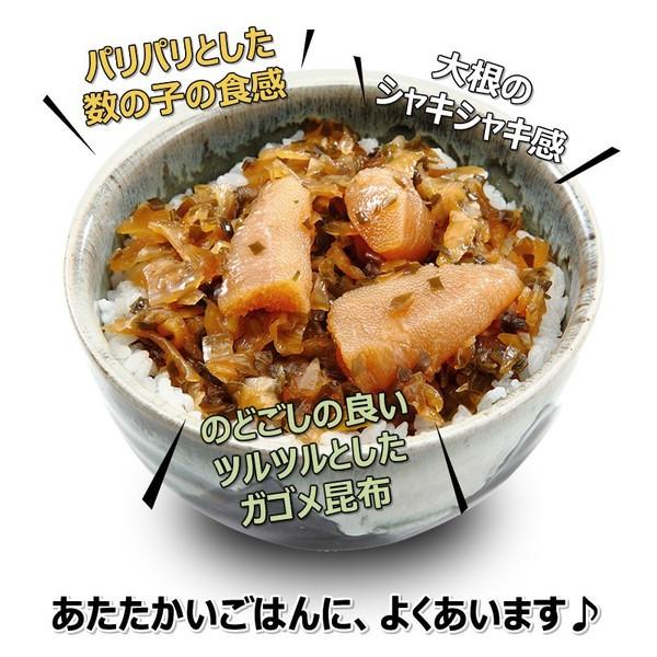 数の子、スルメ、ねばりのある昆布、大根、きゅうりを独自の製法で漬け込んだ醤油漬です。