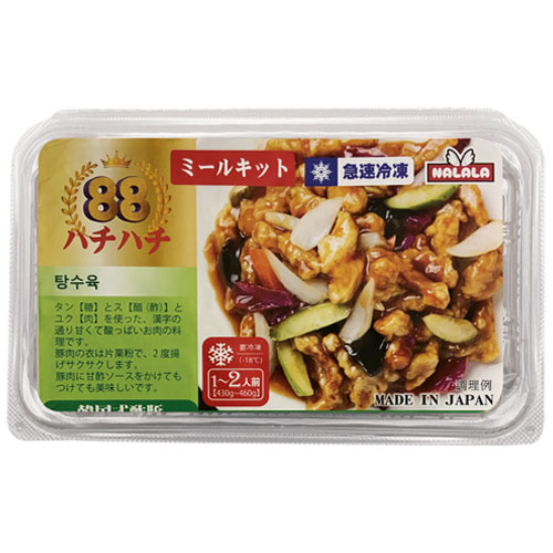 [原材料] 豚肉、澱粉、にんにく、生姜、塩、胡椒、パイナップル、醤油、砂糖、酢、木耳、人参、玉ねぎ、きゅうり [商品説明] 面倒な下ごしらえなしで、時短で本格韓国料理が完成できる 韓国式酢豚、タンスユクのミールキットです。 タン「糖」とス「醋(酢)」とユク「肉」を使った、漢字の通り甘くて酸っぱいお肉の料理です。 豚肉の衣は片栗粉で、2度揚げでサクサクします。 豚肉に甘酢ソースをかけてもつけても美味しいです。 [お召し上がり方] 1.フライパンに油を約2スプーン入れて熱してからタンスユク肉PACKの豚肉を中火で約5〜6分間焼いてください。 ※ 注意:味とクオリティのため、電子レンジの使用は禁止! 冷凍のまま調理してください。 2.タンスユクソースPACKを冷凍のまま電子レンジで温めてください。 ※ 火の通りが悪い場合は、再加熱してください。 ※ 電子レンジの機種によって加熱具合が異なります。 3.更に揚げった豚肉を移し、ソースをかけたり、つけたりお好みに合わせて召し上がりください。 TIP。残りのソースは焼き餃子につけて食べると美味しいです。 [栄養成分・100g当たり] エネルギー 197kcal / たんぱく質 9g / 脂質 7.98g / 炭水化物 21.58g / 食塩相当量 0.37g [原産国] 日本国内製造 ※この商品はクール便でのお届けとなります。