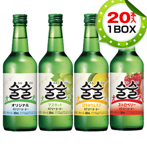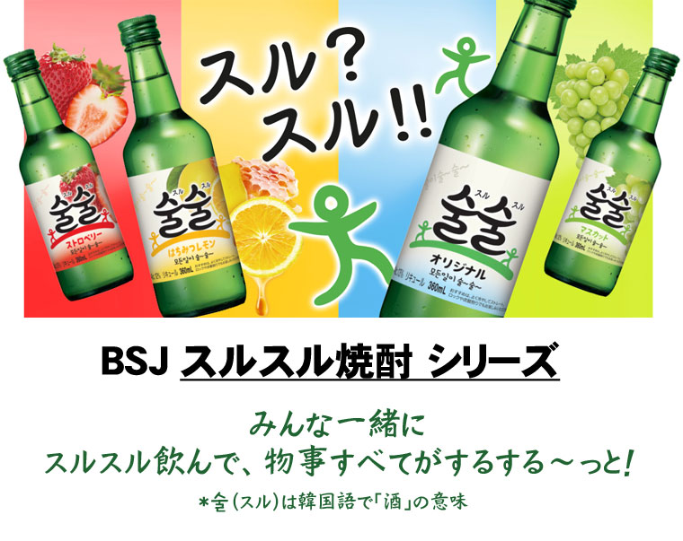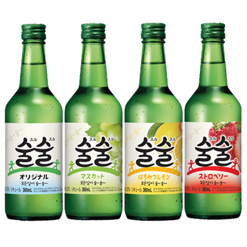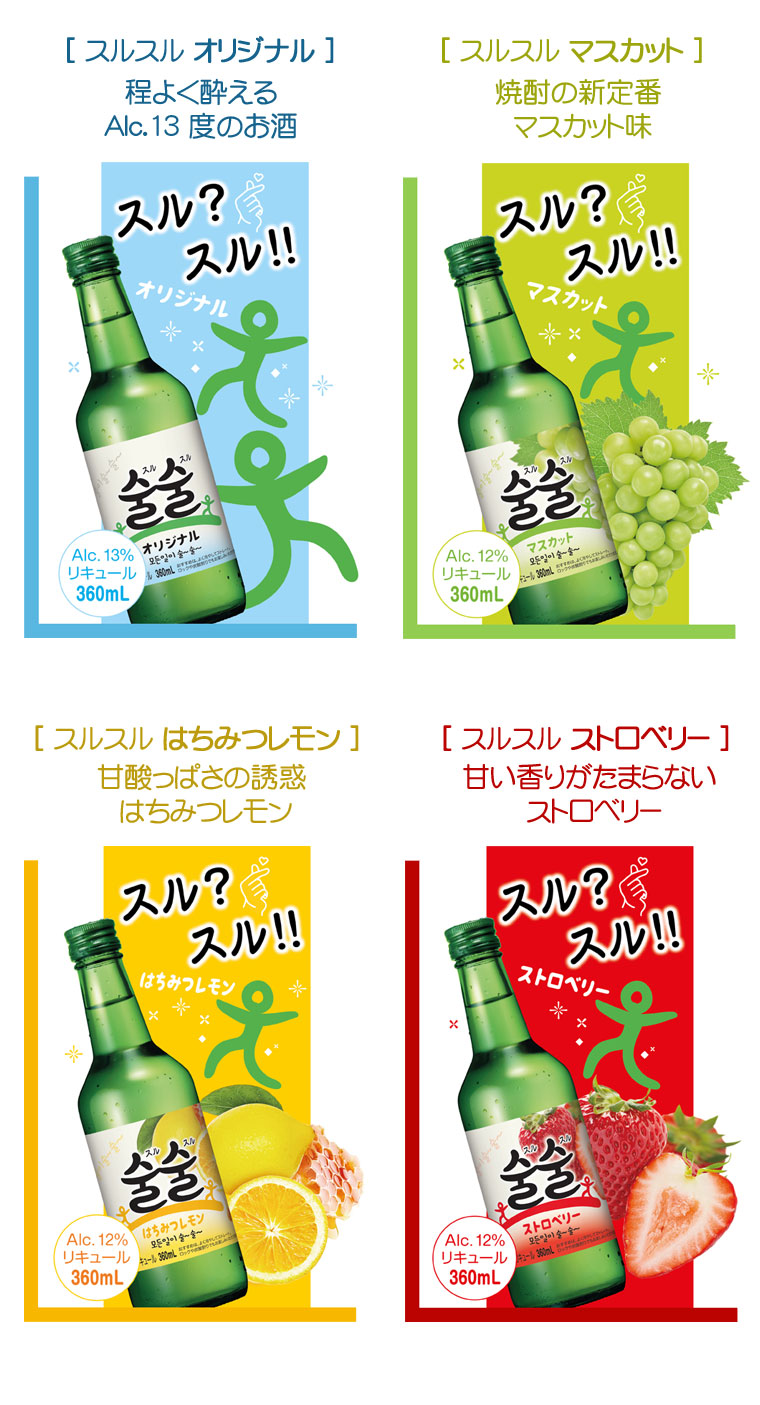 [内容物] 360ml×1本 [賞味期限] 別途表示 [保存方法] 高温多湿を避け、直射日光の当たらない涼しい場所で保管してください。 ※開栓後は冷蔵保管し、なるべく早くお飲みください。 [原材料] [オリジナル] 醸造アルコール、砂糖、果糖/甘味料(酵素処理ステビア) [マスカット] 醸造アルコール、果糖、砂糖、ぶどうエキス/香料、酸味料 [はちみつレモン] 醸造アルコール、砂糖、果糖/酸味料、香料 [ストロベリー] 醸造アルコール、砂糖、果糖/酸味料、香料 [アルコール度] [オリジナル] 13% [マスカット] 12% [はちみつレモン] 12% [ストロベリー] 12% [商品説明] すっきりした味わいの韓国焼酎。輸出大手企業で製造する高品質製品です。 みんな一緒にスルスル飲んで、物事すべてがするする〜っと スルは韓国語で「酒」の意味。 [オリジナル] 人気の韓国焼酎でも度数を抑えた13度。あまりお酒が得意でない方にも楽しんでいただけるお酒です。 [マスカット] 韓国焼酎といえば、今では「マスカット味」が新定番。 [はちみつレモン] はちみつの香りとレモンの酸味が、また飲みたくなる味わい。 [ストロベリー] 芳醇なストロベリーの香りで、お酒がより楽しくなります。 [注意] ※未成年者の飲酒は法律で禁止されています。 ※未成年者への酒類の販売はいたしません。