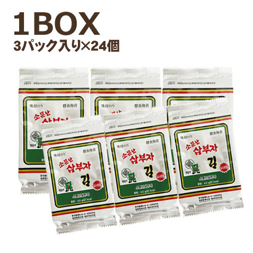 [原材料] 海苔(韓国産51%)、コーン油、ゴマ油、塩 / 調味料(アミノ酸) [商品説明] 韓国を代表するのりのメーカーサンブジャ(三夫者)が自身を持ってお勧めしております。 お子様からお年寄りまでご飯のおかずにぴったりです。 韓国のりはごま油と塩を加味した独特の風味があり、海苔は美容に効果があるとされています。のりはミネラル、カルシウム、鉄分および食物繊維をたくさん含んだ自然食品です。