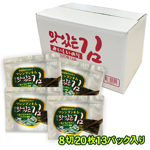 [原材料] 乾のり(韓国産100%)、菜種油、ごま油、食塩 (一部にごま・大豆を含む) ※原材料の乾のりはえび・かにの生息する海域で採取しています。 ※同封の乾燥剤は食べられませんので、ご注意ください。 [商品説明] 韓国味付けのり「パルド」マシンヌンキムは、 多くの方に最高な環境で養殖された高級のりを食べていただこうという思いからの、自家製味付けのりです! 食べやすい大きさに切ったビタミン・食物繊維・鉄分・ミネラルなどなど満載な自然食品の海苔をご飯のお供に、またお酒のおつまみに召し上がりください! もちろん、そのままでも美味しく召し上がれます!