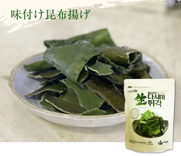 [内容物] 40g×1袋 [賞味期限] 別途表示 [保存方法] 直射日光・高湿・多湿を避けて、涼しい場所で保管してください。 開封したら早めに食べてください。 [原材料] 生昆布(韓国産)59%、コーン油(トウモロコシはいが : ロシア、ハンガリー、ルーマニア産)26%、オリーブオイル(スペイン産)0.5%、白砂糖12%、天日塩(ニュージーランド産) [商品説明] 韓国タシマ(昆布)の油揚げです。 カラリと揚げてあり、さくさくとした歯触りと甘味の味付けが良いハーモニーになっています。 おやつにもおつまみにもおすすめです! [栄養成分:1袋(40g)当たり] エネルギー 213kcal / 炭水化物 25g / 糖類 7g / たんぱく質 2g / 脂質 12g / 飽和脂肪 1g / ナトリウム 192mg / コレステロール 0mg