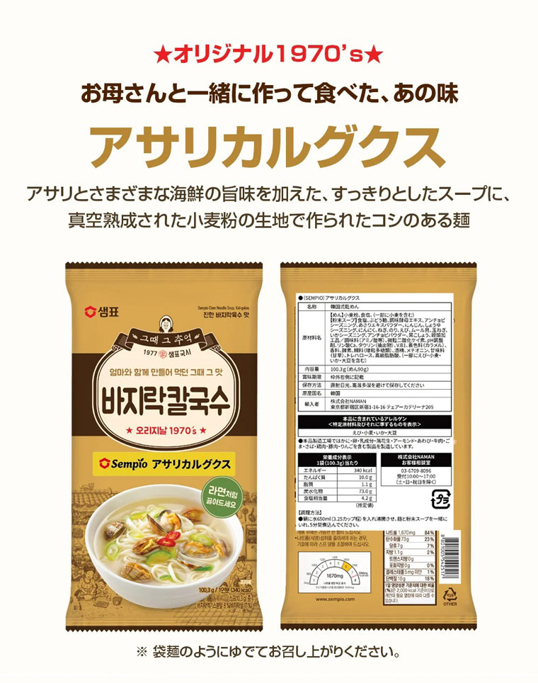 [原材料] [めん] 小麦粉、食塩、(一部に小麦を含む)、[粉末スープ] 食塩、ぶどう糖、調味酵母エキス、アンチョビシーズニング、あさりエキスパウダー、にんじん、しょうゆシーズニング、にんにく、ねぎ、のり、えび、ムール貝、玉ねぎ、いかシーズニング、アンチョビパウダー、黒こしょう、穀類加工品、調味料(アミノ酸等)、微粒二酸化ケイ素、pH調整剤、リン酸Ca、タウリン(抽出物)、V.B1、着色料(カラメル)、香料、酵素、糊料(増粘多糖類)、酒精、メチオニン、甘味料(甘草)、トレハロース、高級脂肪酸(※一部にえび・小麦・いか・大豆を含む) [商品説明] 懐かしの韓国の味を手軽に楽しめる本格ククス! 麺とスープがセットになっていて、簡単に本格的な一杯が作れます。 麺を油に上げないので、おいしくて健康にも良い、簡単なウェルビーイング韓国の麺料理です。 昔の手打ち製法の知恵を活かし、真空熟成半乾燥製法で生地の中の空気をしっかり抜き、熟成させることでさらにコシのある食感に仕上げました。 アサリとさまざまな海鮮の旨味を加えた、さっぱりしたスープに、真空熟成された小麦粉の生地で作られたコシのある麺が逸品のアサリカルグクスです。 [作り方] 鍋に水650ml(3.25カップ程)を入れ沸騰させ、麺と粉末スープを一緒に入れ、5分間煮込んでください。 ※お好みにより、ねぎ、のり、たまご等を加えてもおいしくお召し上がりいただけます。