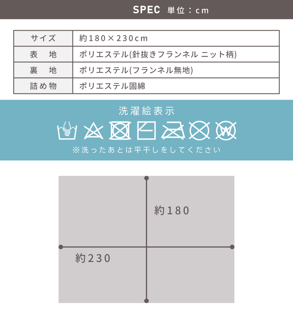 | 材質 | 表地:ポリエステル(針抜きフランネル ニット柄) 裏地:ポリエステル(平織生地) 詰物:ポリエステル(固綿) |