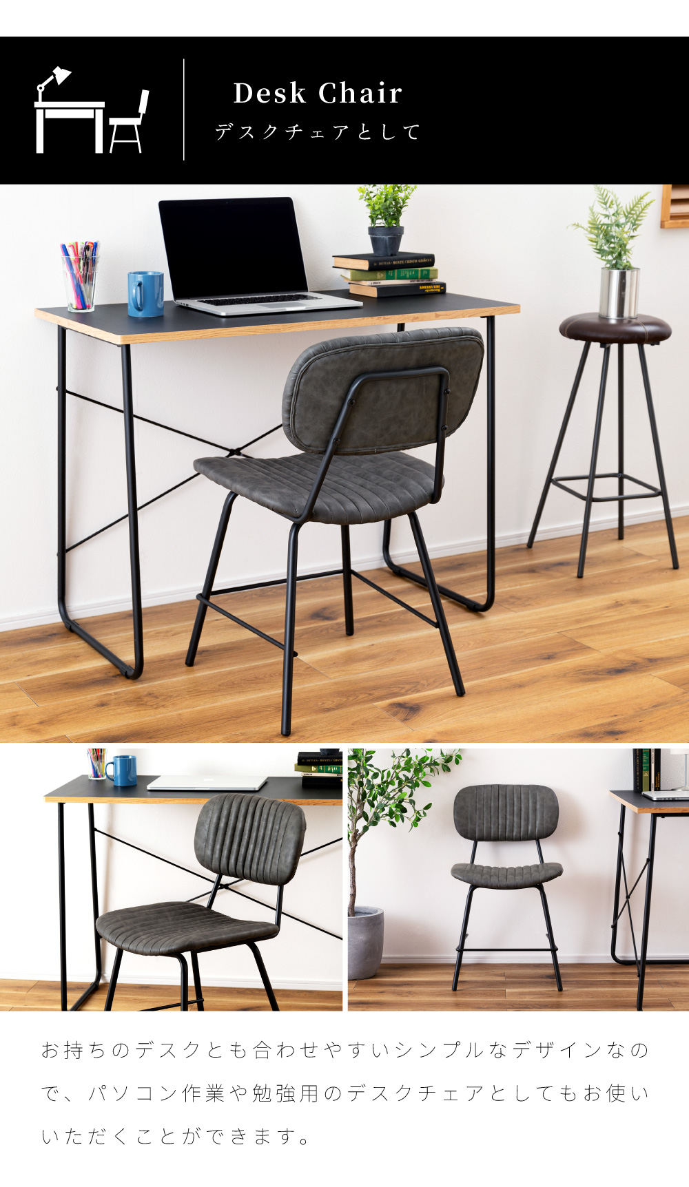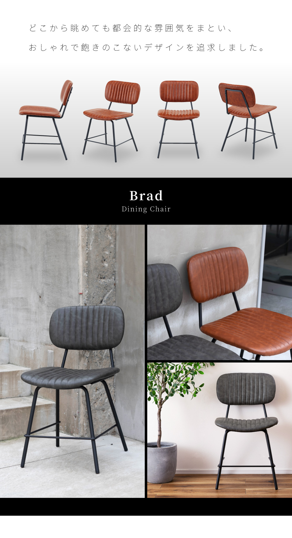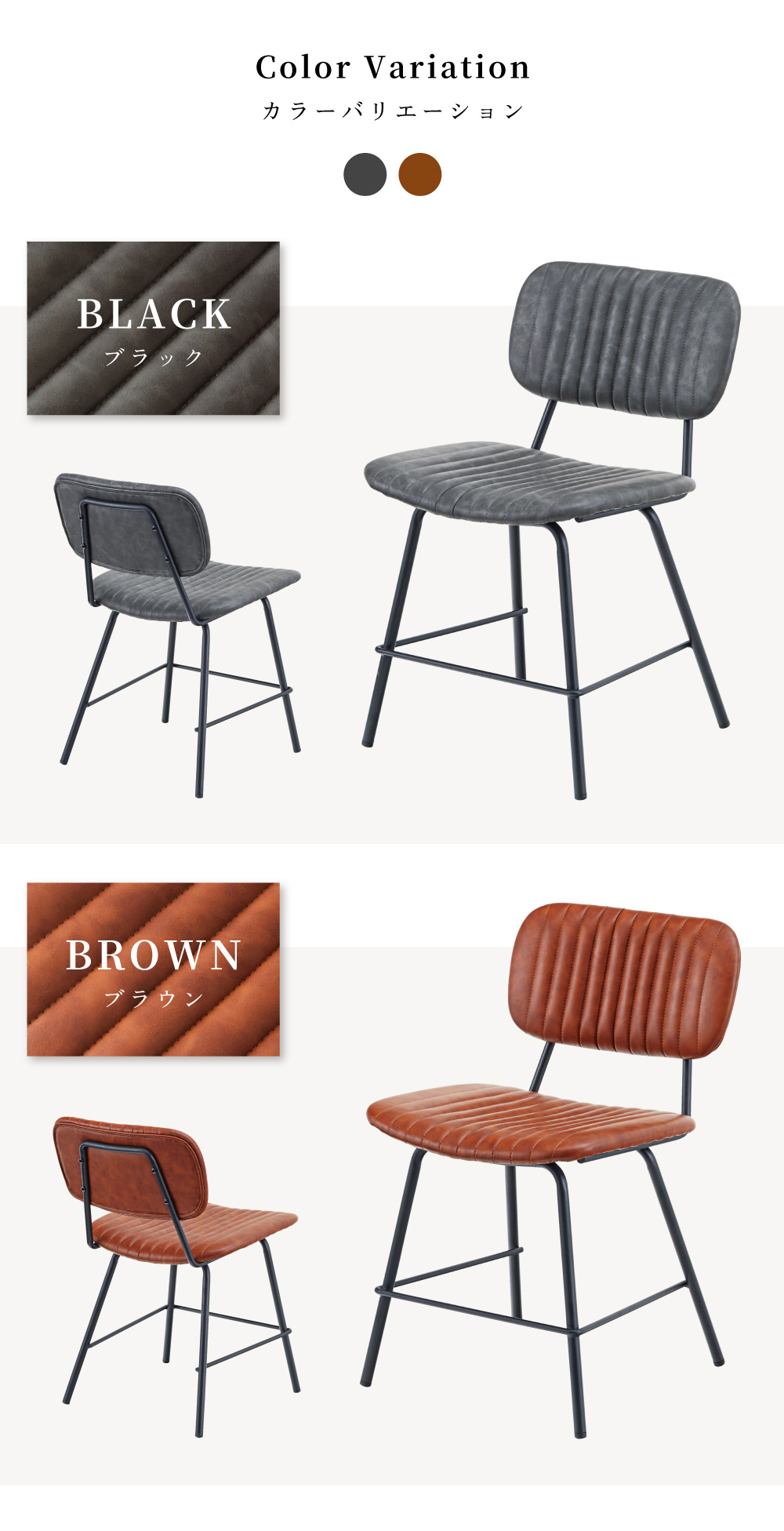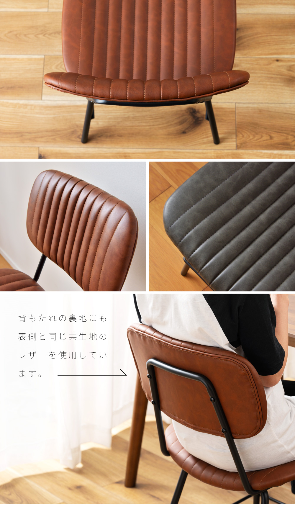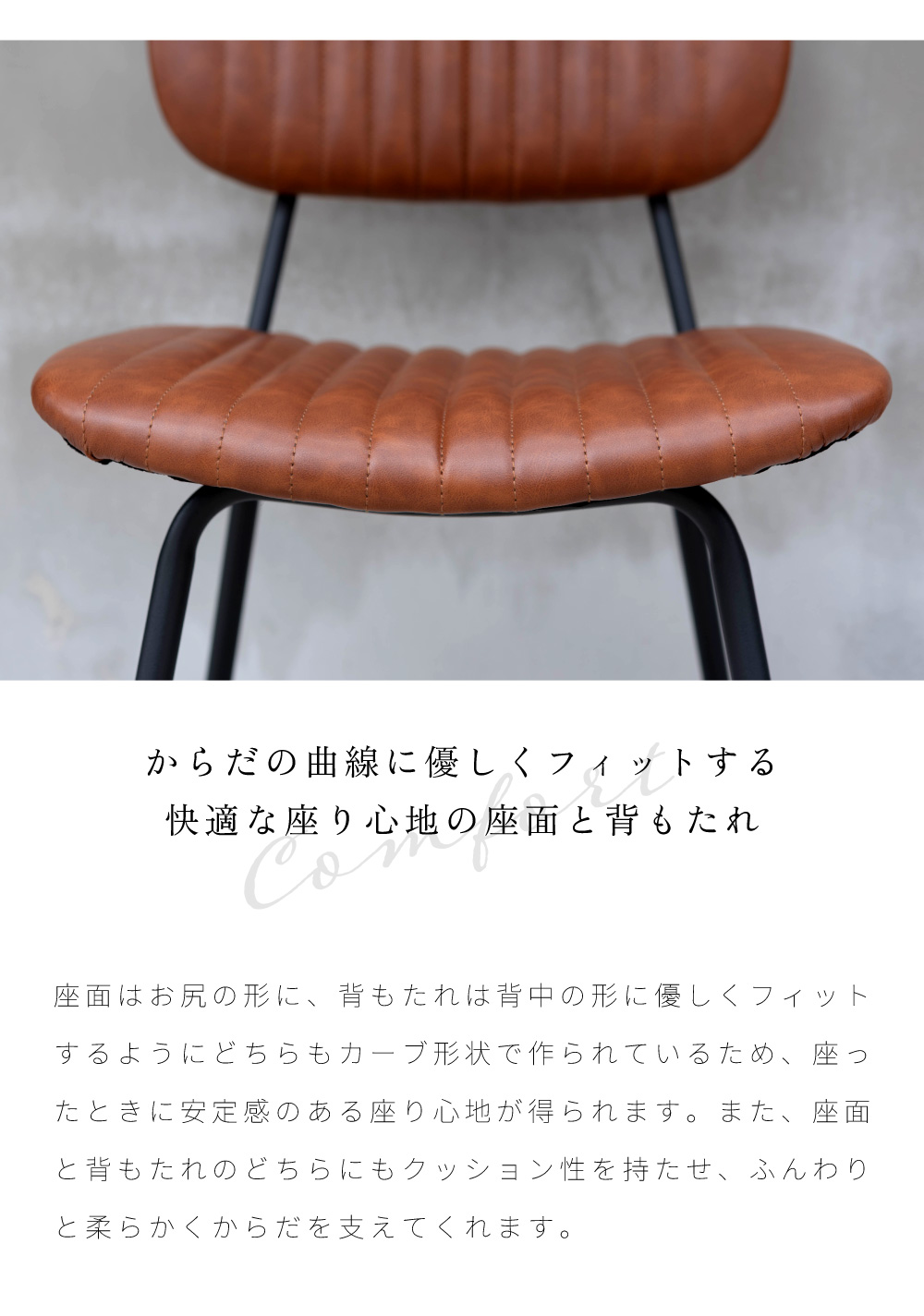 | ポイント | ●スチール×レザーの異素材を組み合わせたインダストリアルデザイン 高級感のある本革風のソフトレザーとマットな質感の黒いスチールフレームを組み合わせることで、洗練されたインダストリアルな空間を演出することができます。 飽きのこない都会的なデザインは、流行に流されることのない確固たるセンスを感じさせてくれます。 ●テクスチャまで本革を意識したこだわりのソフトレザー生地 本革の手に馴染むような質感と濃淡のあるシワを細部まで再現したこだわりのソフトレザー生地を張地として使用しました。 生地にこだわっているため本革に引けを取らない高級感を放ち、ワンランク上の空間に仕上げてくれます。 ●からだの曲線に優しくフィットする快適な座り心地の座面と背もたれ 座面はお尻の形に、背もたれは背中の形に優しくフィットするようにどちらもカーブ形状で作られているため、座ったときに安定感のある座り心地が得られます。 また、座面と背もたれのどちらにもクッション性を持たせ、ふんわりと柔らかくからだを支えてくれます。 背もたれの裏地にも表側と同じ共生地のレザーを使用しています。 |