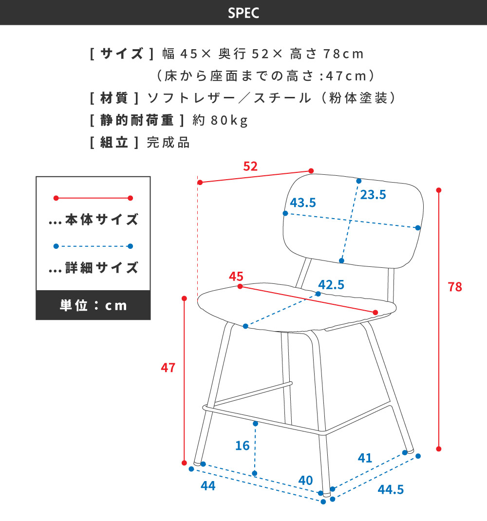 | サイズ | 幅45×奥行き52×高さ78cm 座面までの高さ:47cm 【詳しいサイズ図はコチラ】 |