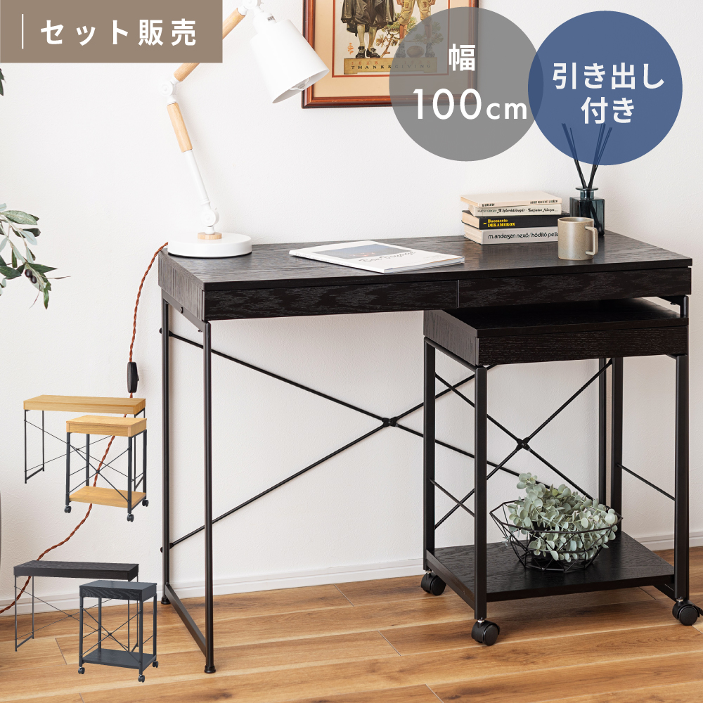 パソコンデスク 幅100 デスクワゴンセット 引き出し ワゴン付き 机 キャスター 収納 スリム コンパクト アイアン 木製 木目 学習机 I字 2点セット 黒 シンプル おしゃれ PCデスク プリンター台  省スペース 一人暮らし ブラック ナチュラル オーク材 リビング 入学祝
