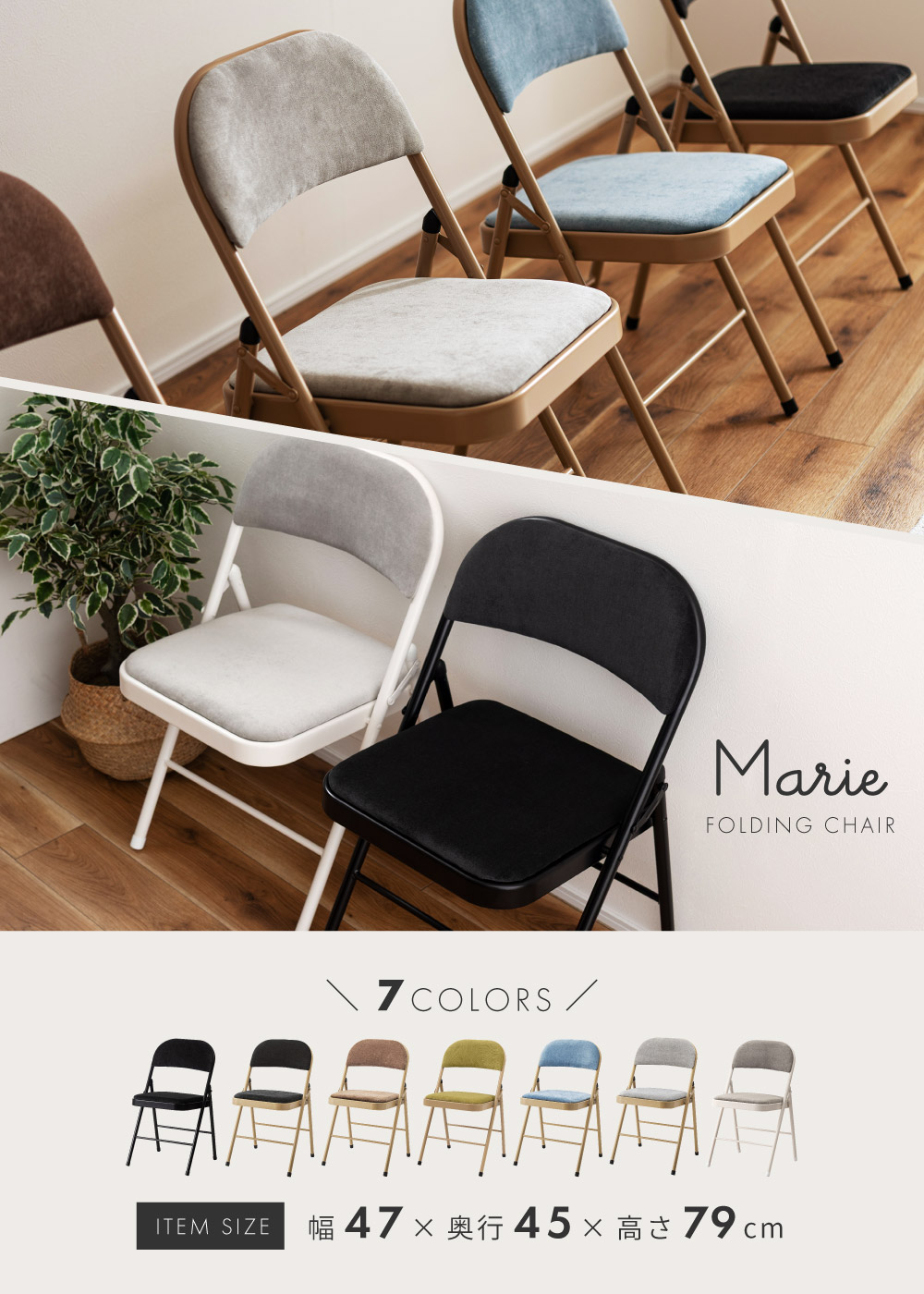 | サイズ | 幅47×奥行45×高さ79cm 座面までの高さ:44.5cm 折りたたみ時:奥行9×高さ96cm 【詳しいサイズ図はコチラ】 |
