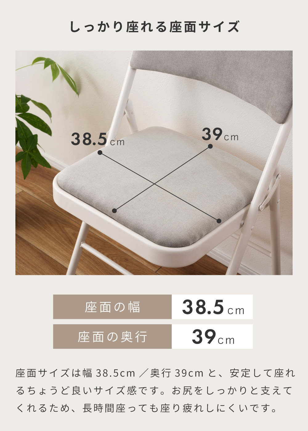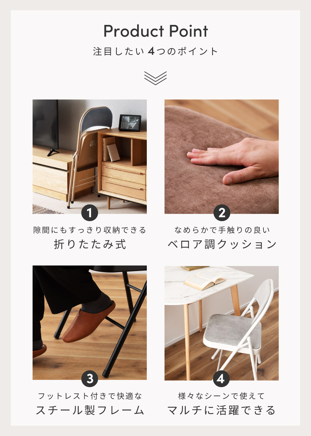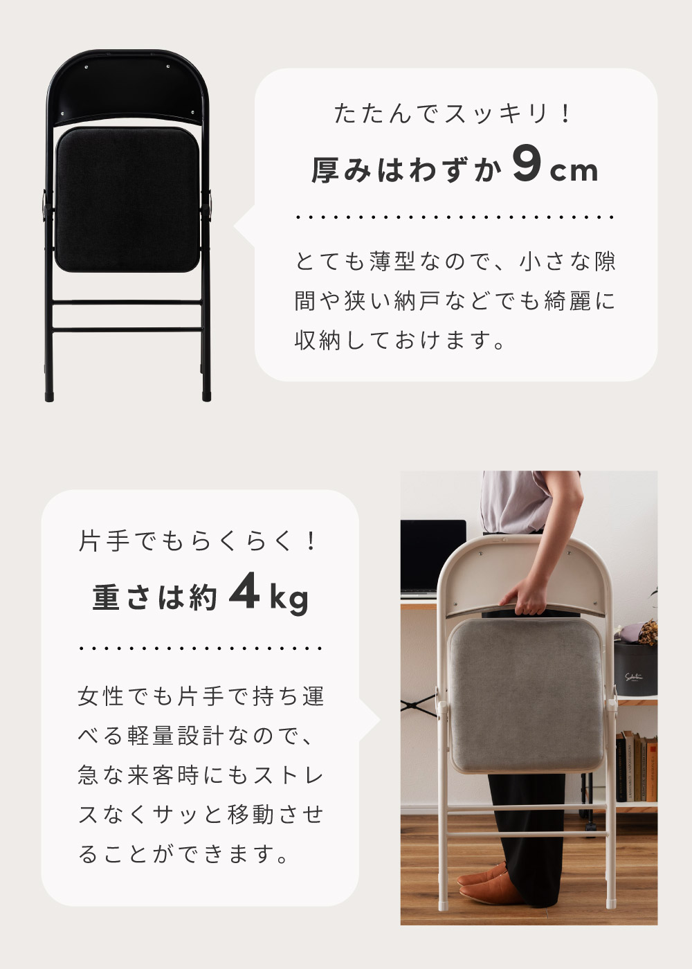 | ポイント | ●隙間にすっきり収納できる、場所を取らない折りたたみ式。 コンパクトに折りたためるので、ちょっとした隙間などにしまって場所を取ることなくスッキリと収納しておくことができます。 ●たたんでスッキリ!厚みはわずか9cm とても薄型なので、小さな隙間や狭い納戸などでも綺麗に収納しておけます。 ●片手でもらくらく!重さは約4kg 女性でも片手で持ち運べる軽量設計なので、急な来客時にもストレスなくサッと移動させることができます。 ●なめらかで手触りの良いベロア調の座面クッション 座面と背もたれの両方にもっちりとしたクッション材を入れ、表面を手触りの良いなめらかなベロア調生地で覆っているため贅沢な座り心地を得ることができます。 ●しっかり座れる座面サイズ 座面サイズは幅38.5cm/奥行39cmと、安定して座れるちょうど良いサイズ感です。 お尻をしっかりと支えてくれるため、長時間座っても座り疲れしにくいです。 ●フットレスト付きで快適なスチール製フレームを使用 フットレスト付きで足が置きやすい、丈夫なスチールフレームを採用。 表面には粉体塗装を施しています。 淡い光沢感がベロア調生地とも相性抜群です。 ●たとえばこんな使い方 ・デスクチェアとして ・急な来客用のチェアとして ・待合室や会議室のチェアとして |