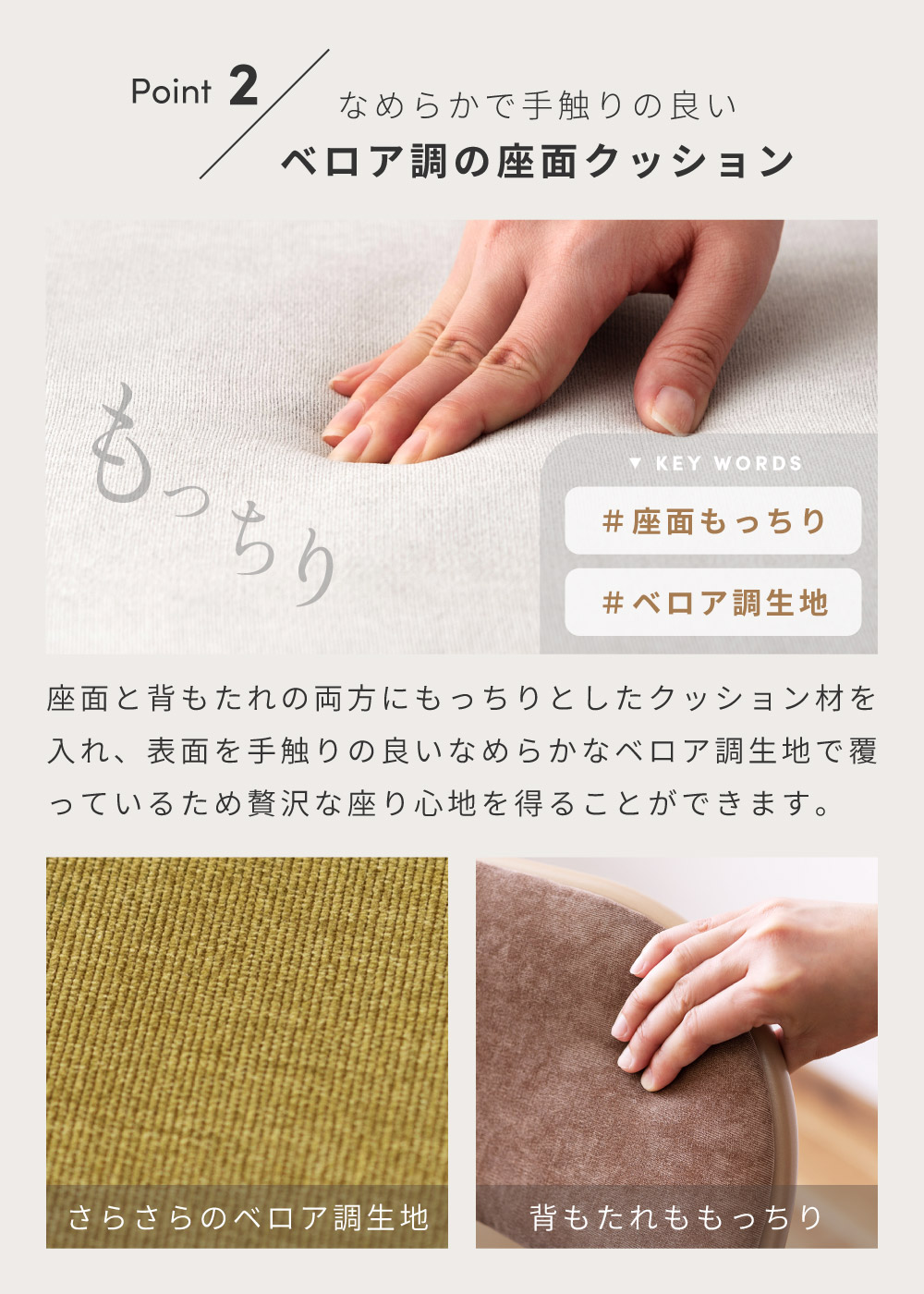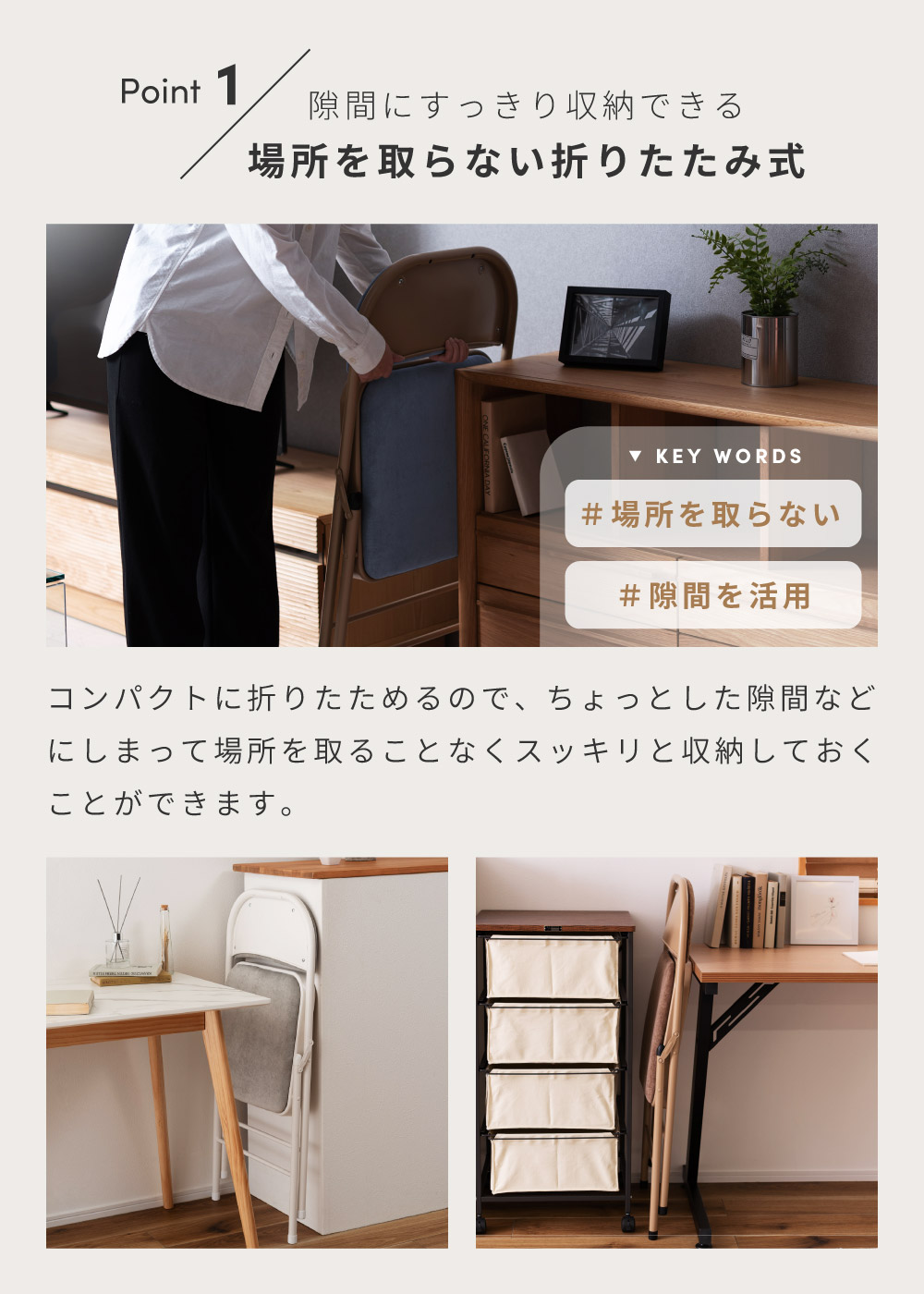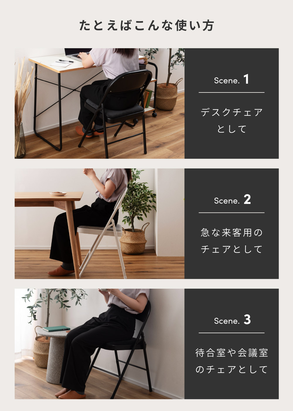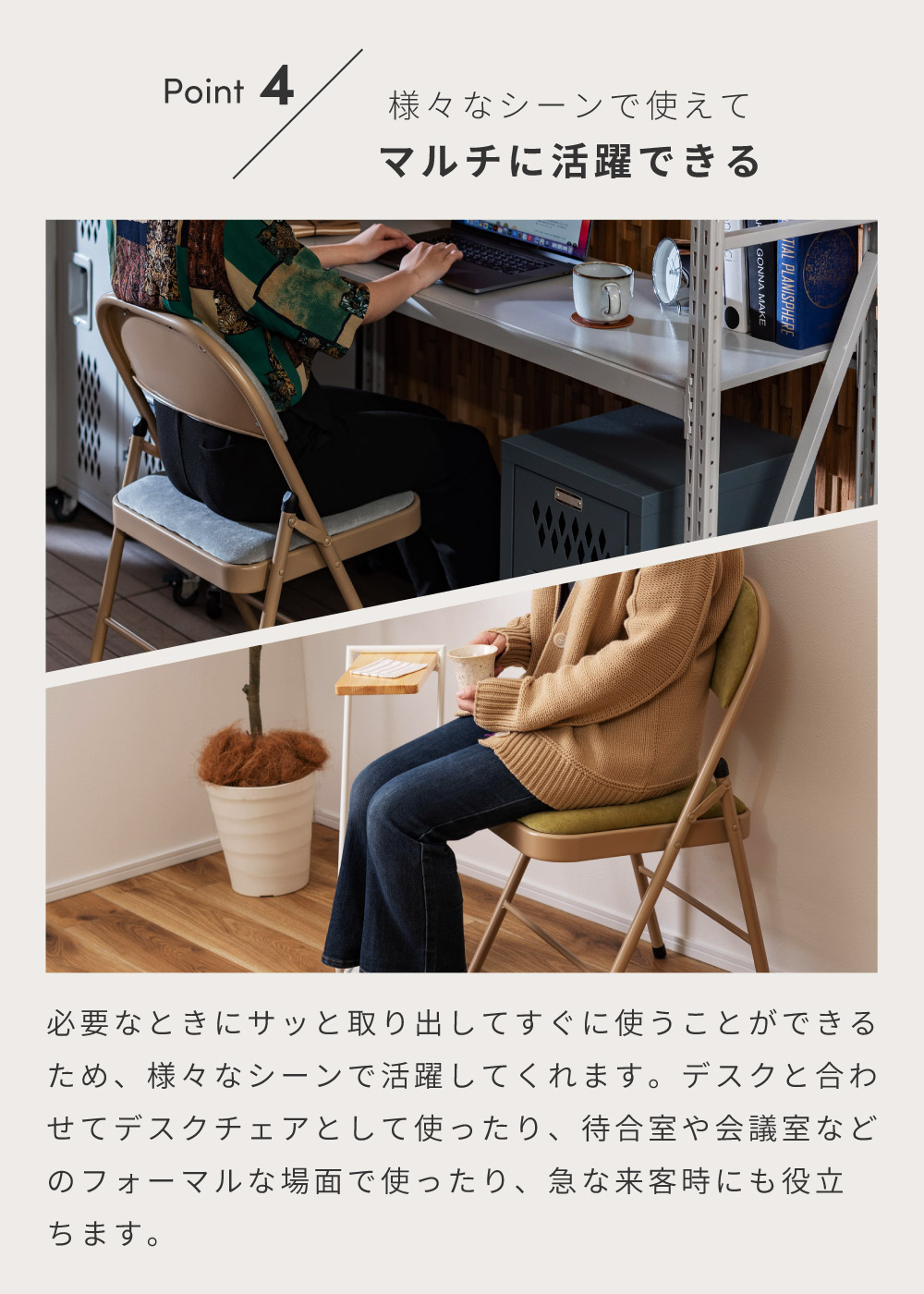 | ポイント | ●隙間にすっきり収納できる、場所を取らない折りたたみ式。 コンパクトに折りたためるので、ちょっとした隙間などにしまって場所を取ることなくスッキリと収納しておくことができます。 ●たたんでスッキリ!厚みはわずか9cm とても薄型なので、小さな隙間や狭い納戸などでも綺麗に収納しておけます。 ●片手でもらくらく!重さは約4kg 女性でも片手で持ち運べる軽量設計なので、急な来客時にもストレスなくサッと移動させることができます。 ●なめらかで手触りの良いベロア調の座面クッション 座面と背もたれの両方にもっちりとしたクッション材を入れ、表面を手触りの良いなめらかなベロア調生地で覆っているため贅沢な座り心地を得ることができます。 ●しっかり座れる座面サイズ 座面サイズは幅38.5cm/奥行39cmと、安定して座れるちょうど良いサイズ感です。 お尻をしっかりと支えてくれるため、長時間座っても座り疲れしにくいです。 ●フットレスト付きで快適なスチール製フレームを使用 フットレスト付きで足が置きやすい、丈夫なスチールフレームを採用。 表面には粉体塗装を施しています。 淡い光沢感がベロア調生地とも相性抜群です。 ●たとえばこんな使い方 ・デスクチェアとして ・急な来客用のチェアとして ・待合室や会議室のチェアとして |