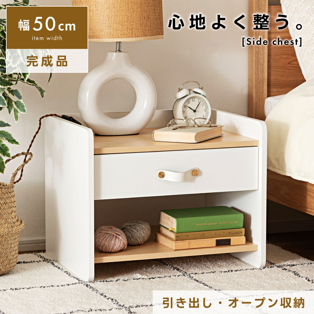 サイドチェスト サイドテーブル 幅50 ベッドサイドテーブル 木製 引出し 棚 おしゃれ ソファ リビング 収納付き 完成品 本棚 シンプル チェスト 机 ホワイト