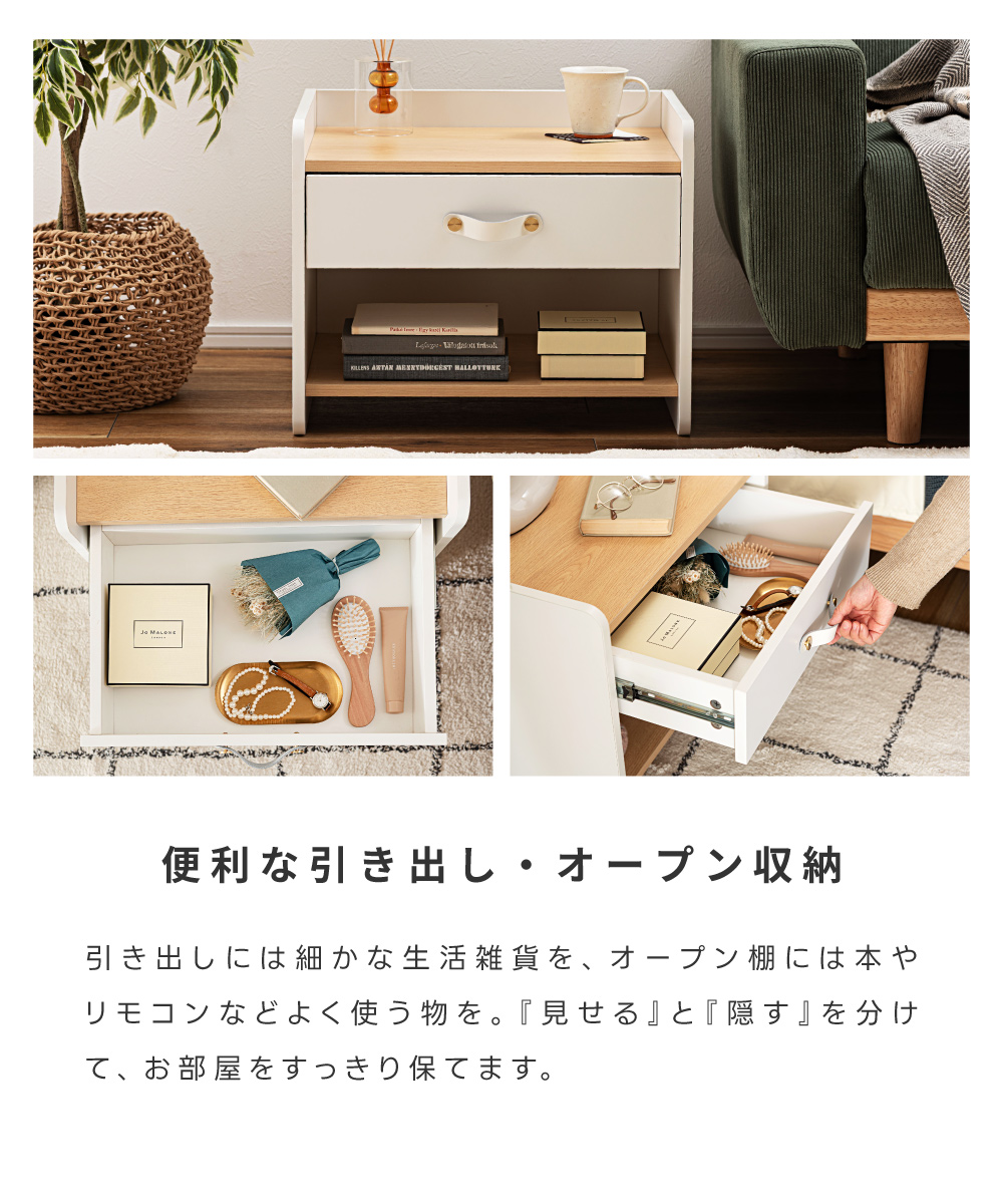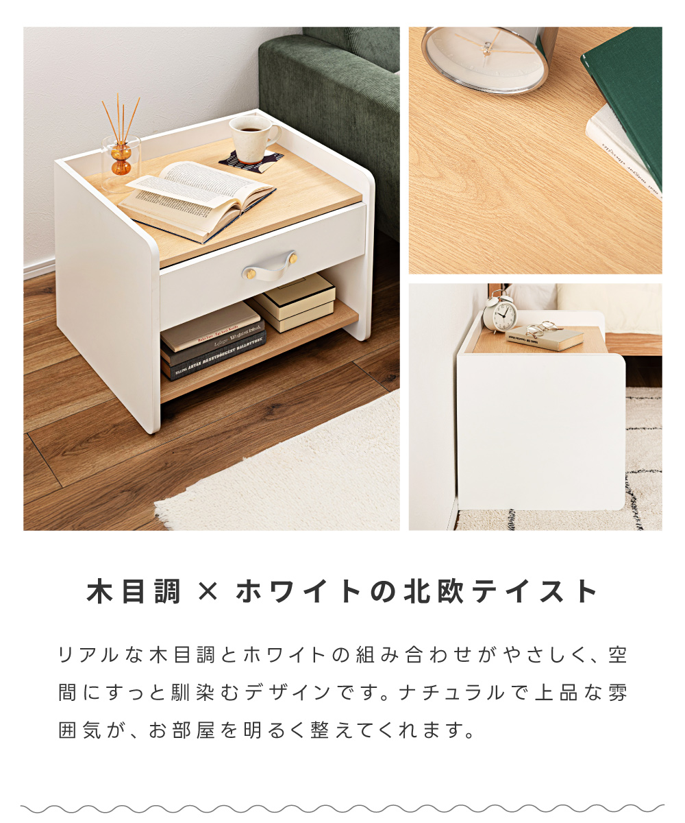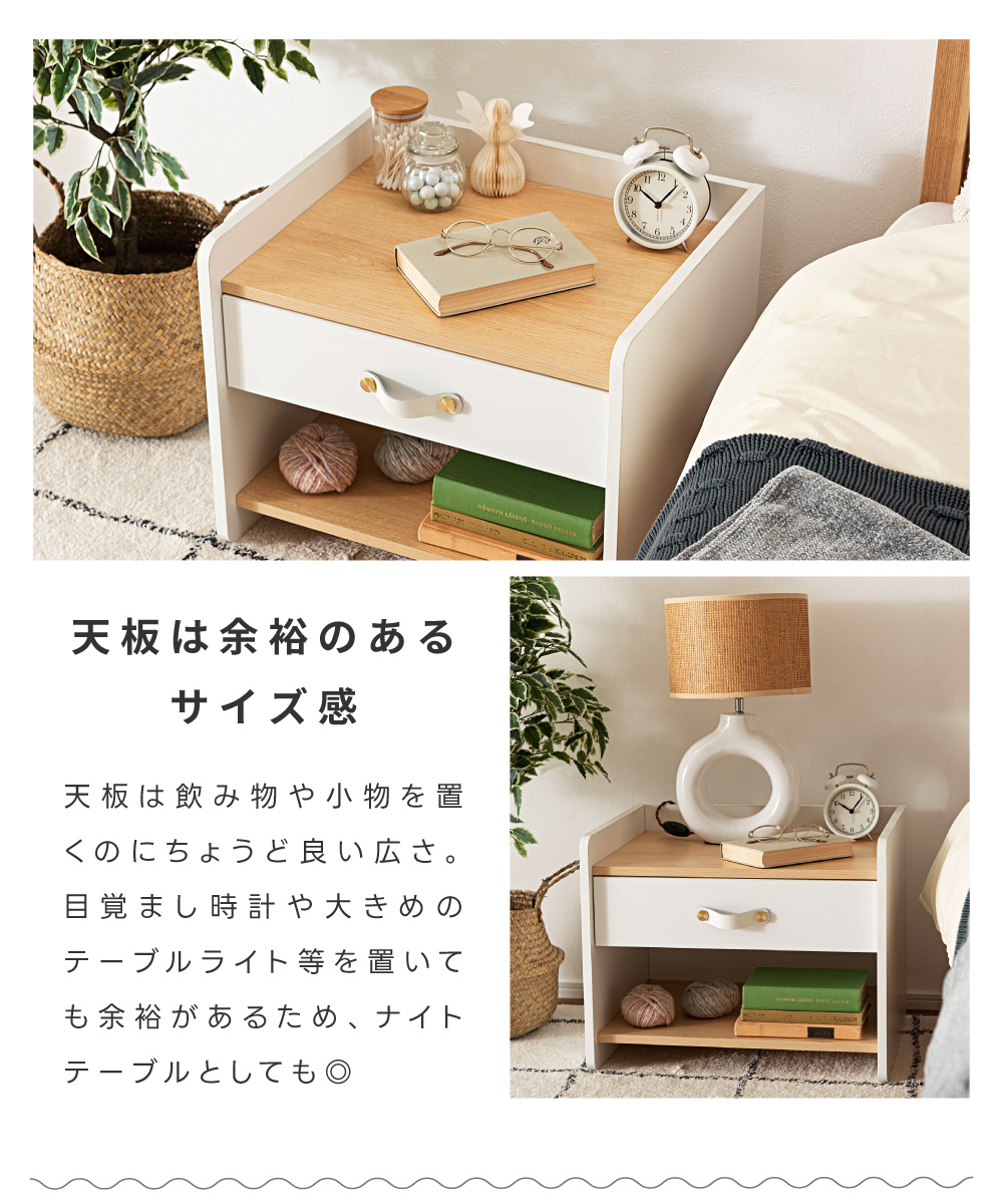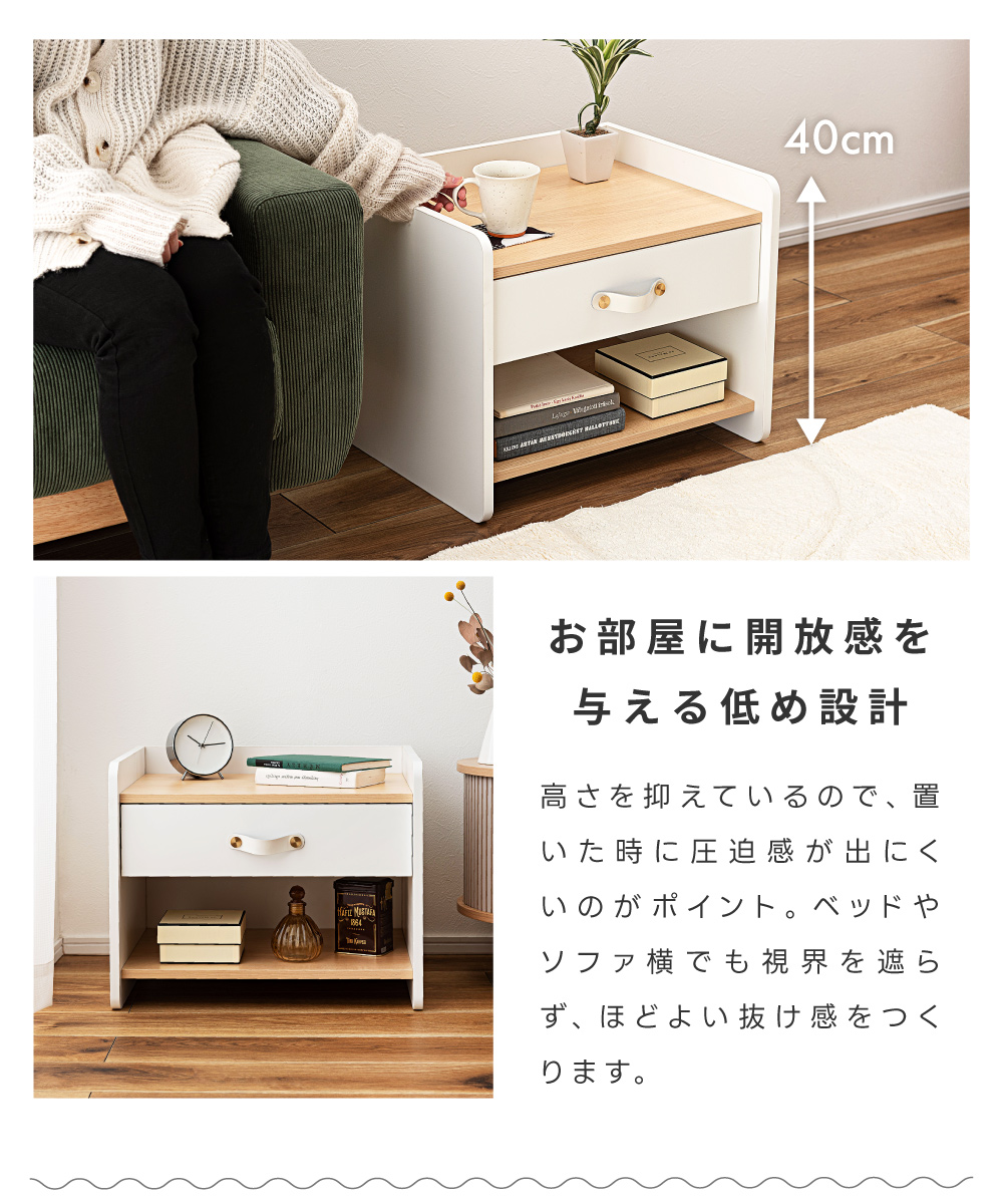 | ポイント | 圧迫感のない低め設計と、ほどよい収納力が魅力の北欧風サイドチェスト ●リアルな木目調×ホワイトの北欧テイスト ナチュラルで上品な雰囲気が、お部屋を明るく整えてくれます。 ●お部屋に開放感を与える低め設計 ベッドやソファ横でも視界を遮らないため、圧迫感が出にくくほどよい抜け感をつくります。 ●天板は小さすぎない丁度いい広さ 目覚まし時計や大きめのテーブルライト等を置いても余裕があるため、ナイトテーブルとしても◎ ●便利な引き出し・オープン収納 引き出しには細かな生活雑貨を、オープン棚には本やリモコンなどよく使う物を。 『見せる』と『隠す』を分けて、お部屋をすっきり保てます。 ・スムーズに動くスライドレール ・上品な印象の合皮製の取っ手 |